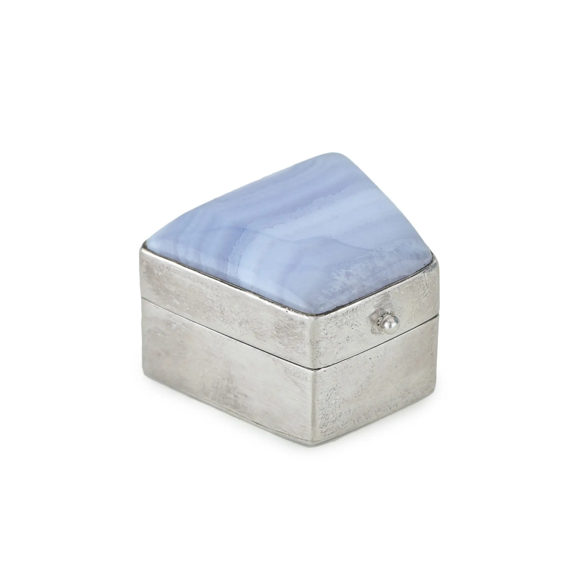 This distinctive box features a unique geometric design, expertly crafted in gleaming sterling silver. The polished silver frame complements the soft hues of the blue lace agate, enhancing its natural beauty. The smooth, cool touch of the silver provides a tactile contrast to the gemstone's delicate texture. The hinged lid opens smoothly to reveal a small storage space, perfect for holding tiny treasures or keepsakes. Meticulously handcrafted, this box showcases the skill and artistry of experienced jewelers. Its compact design allows for versatile placement, whether displayed on a vanity, desk, or shelf, adding a touch of understated elegance to any space. More than just a decorative object, it's a functional piece of art that embodies both beauty and practicality.