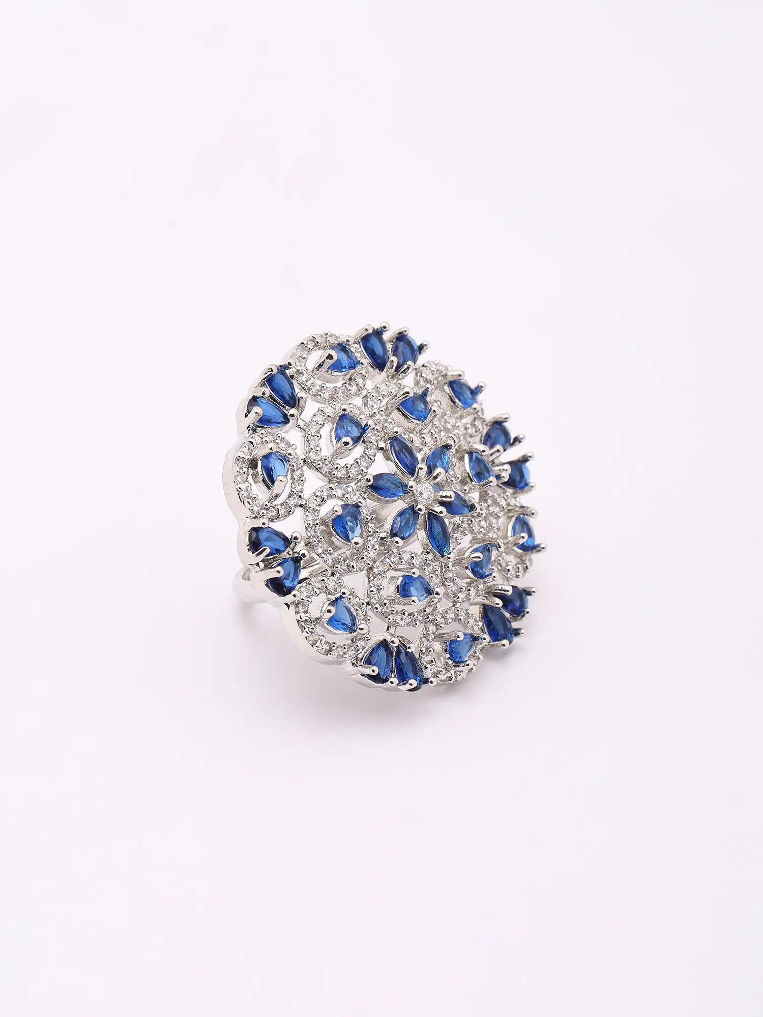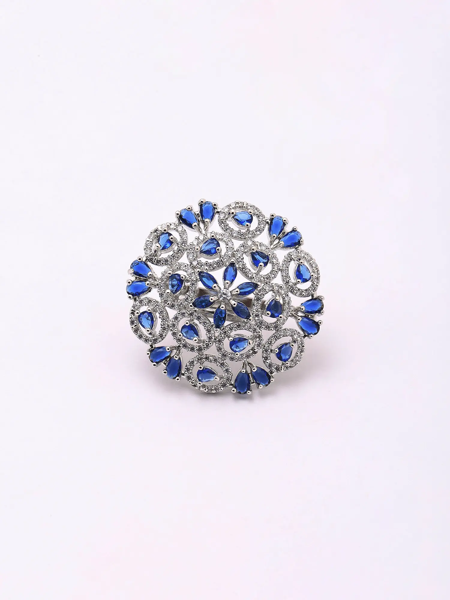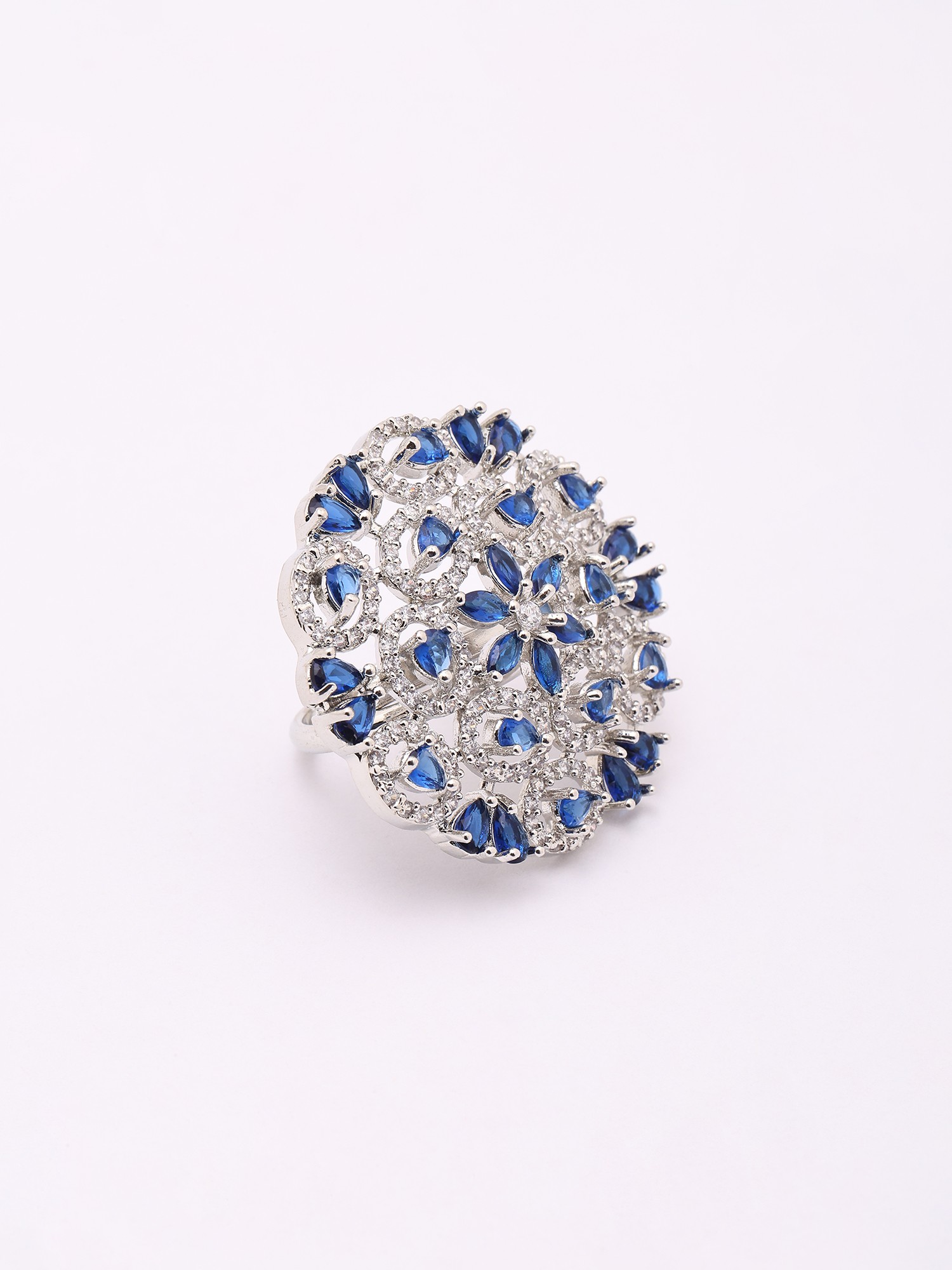 Blue Stone Floral Cluster American-Diamond Adjustable Statement Ring