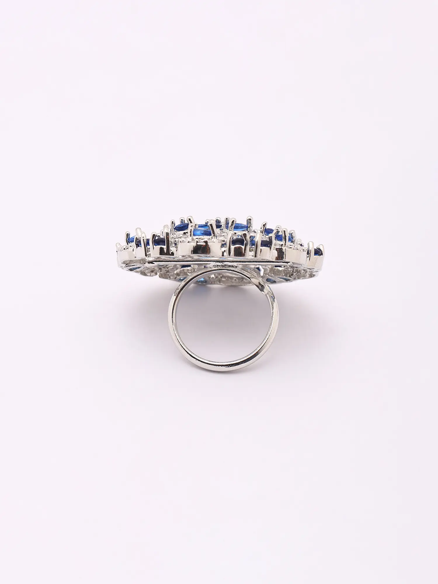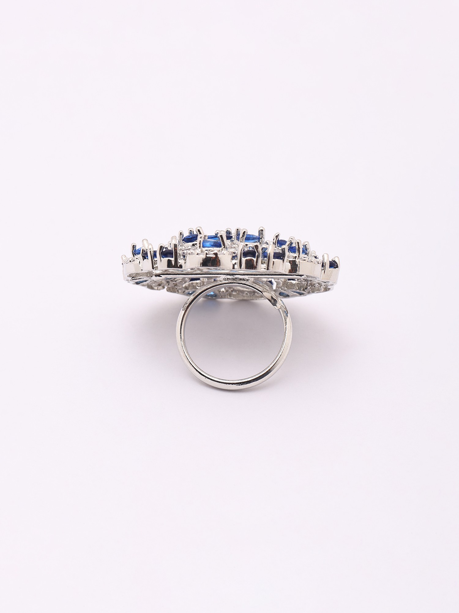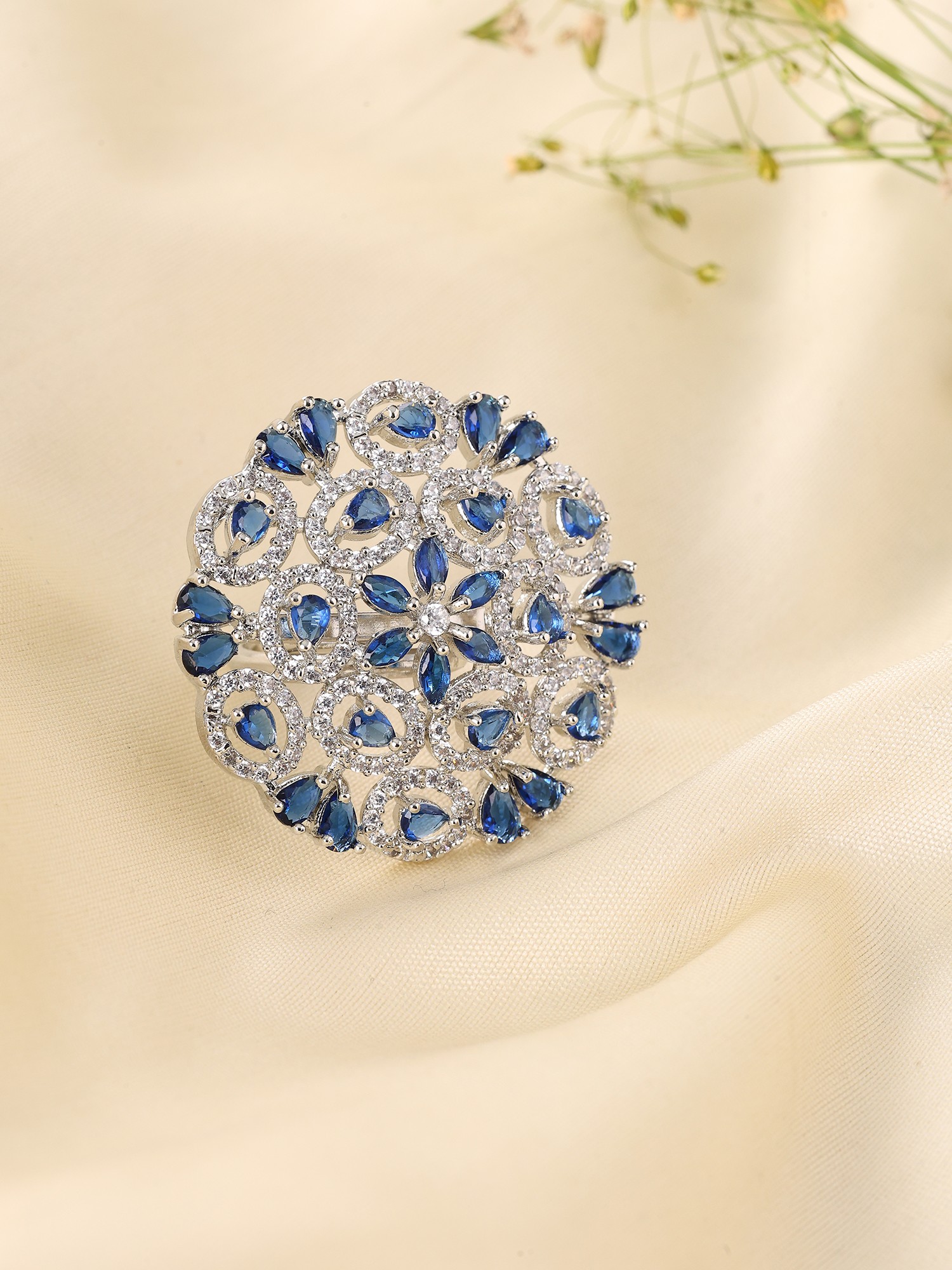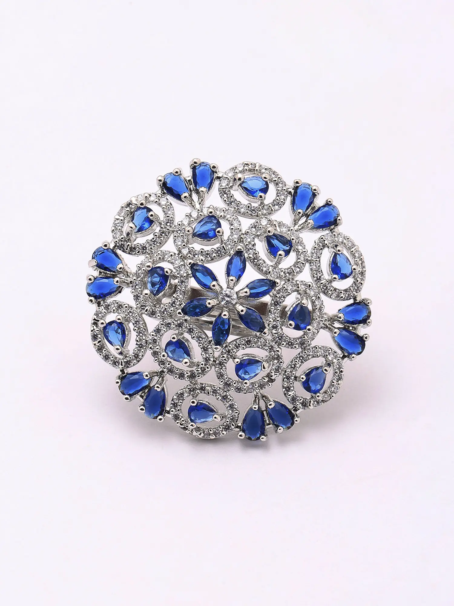 Blue Stone Floral Cluster American-Diamond Adjustable Statement Ring