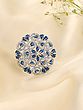 The design unfolds like a blooming flower, with a central cluster of striking blue teardrop-shaped stones radiating outwards. These are embraced by a swirling pattern of smaller blue stones and pave-set American diamonds, all meticulously arranged within a circular motif that measures approximately 1.45 inches in width. The total height of this centerpiece, reaching about 1.05 inches, ensures it commands attention without overwhelming.