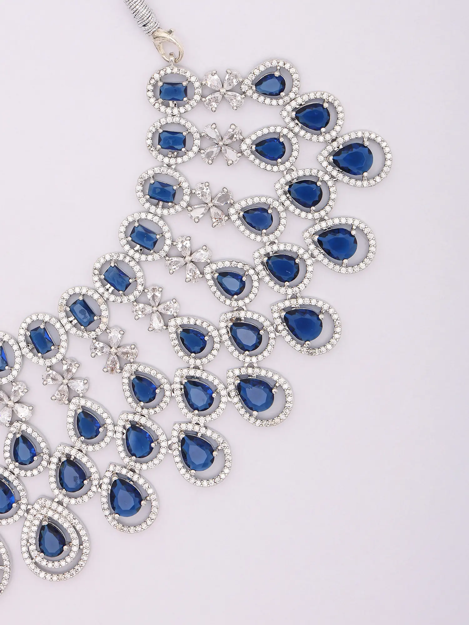 Features a striking central necklace adorned with deep blue teardrop stones.
