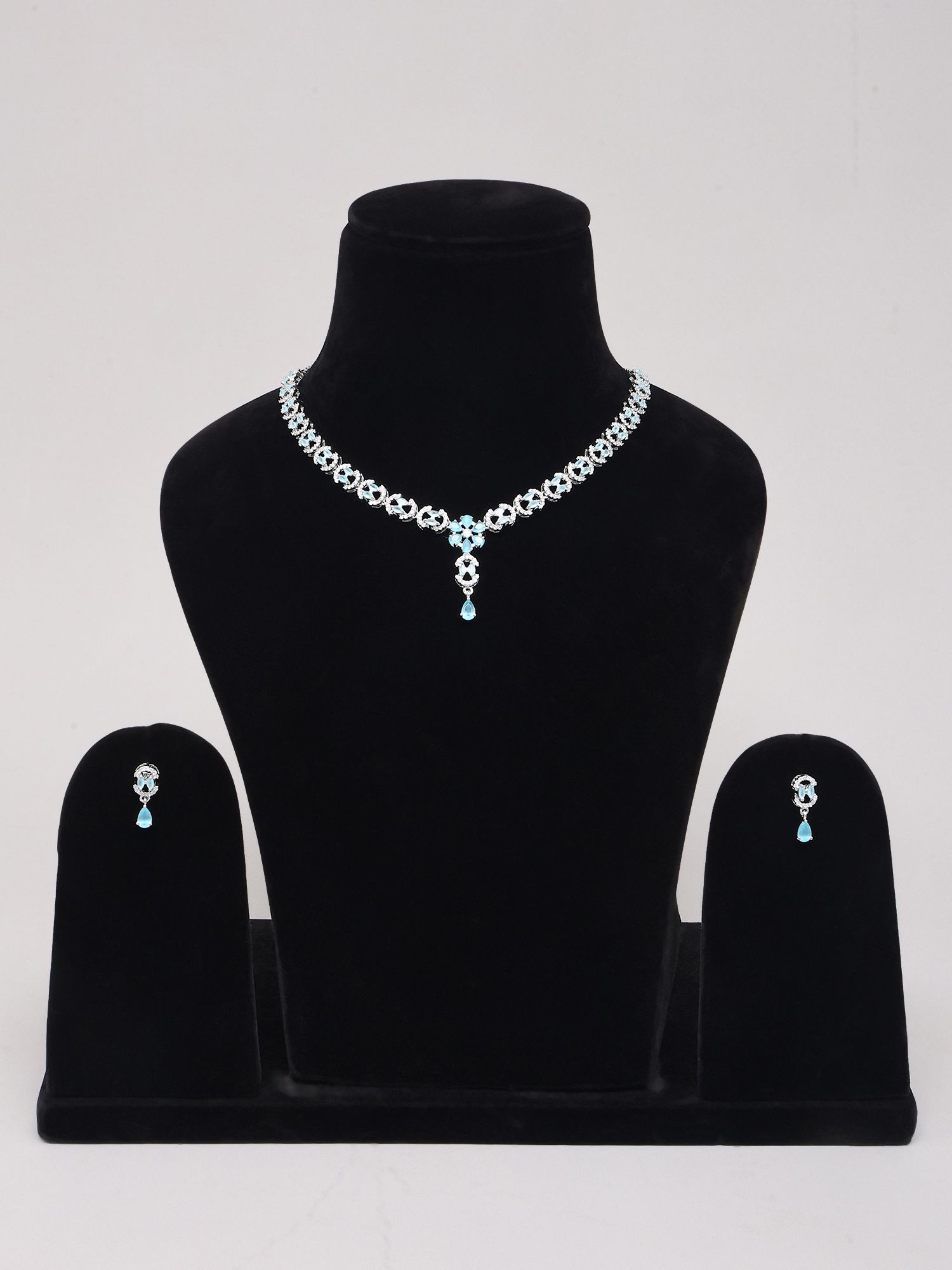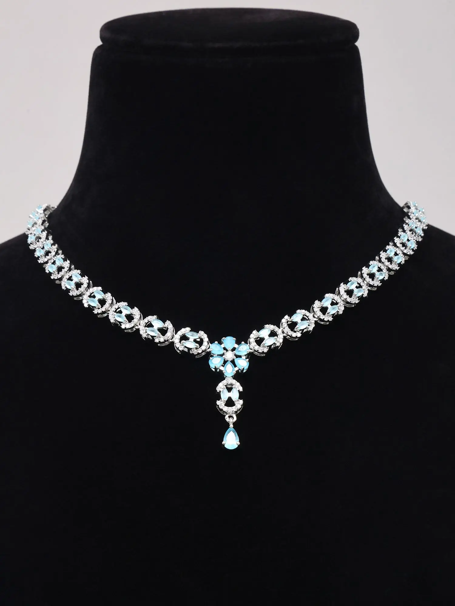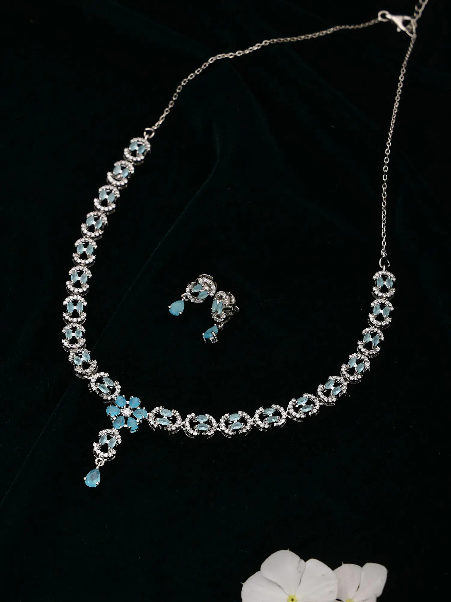 The necklace, designed with an adjustable chain reaching up to 18.2 inches, drapes gracefully to accentuate your neckline. Its centerpiece, a delicate floral motif, is beautifully rendered with brilliant blue stones that catch the light with every movement. Complementing the necklace, the earrings echo this enchanting design. Each earring, approximately 0.6 inches in height and depth, features a teardrop-shaped blue stone that sways gently, adding a touch of ethereal charm. The surrounding silverwork on both pieces is exquisitely detailed, enhancing the allure of the central gemstones.