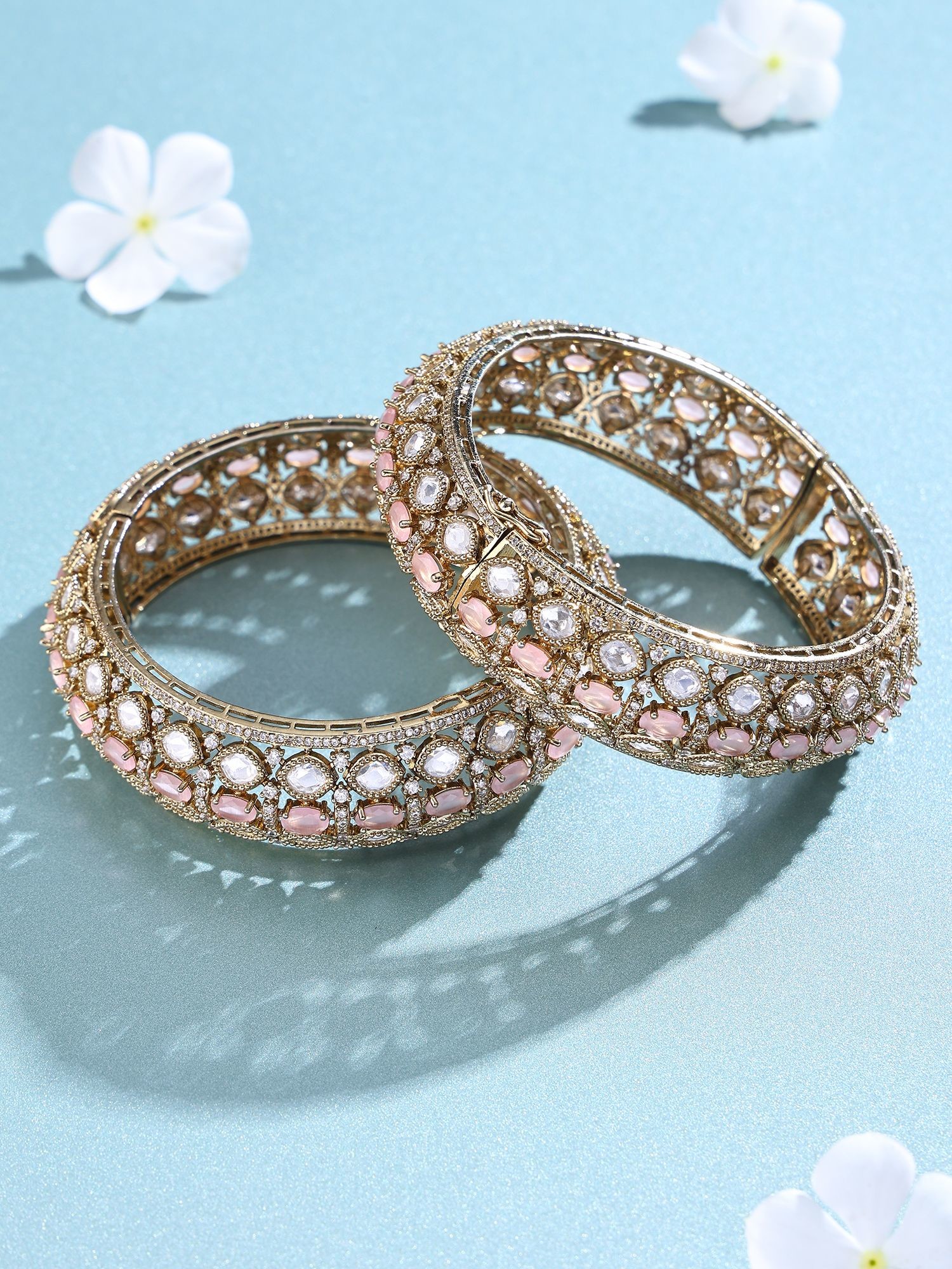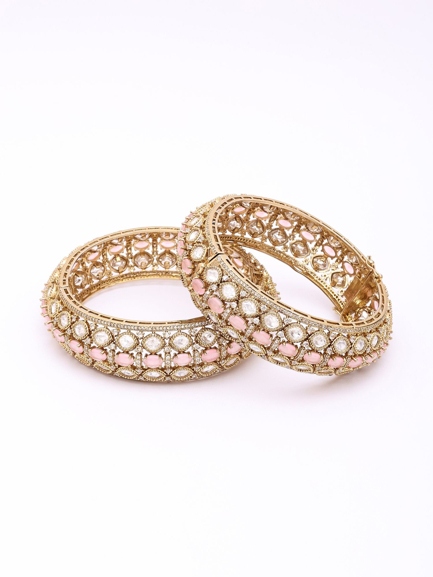 Each bangle is meticulously crafted from brass, chosen for its lustrous quality and enduring strength, forming the ideal canvas for this detailed artistry. The intricate Polki detailing, a traditional uncut diamond setting technique, breathes life into the design, while precisely placed blush pink stones offer a delicate contrast. You'll appreciate the openable design, a thoughtful inclusion that ensures both ease of wear and a secure fit.