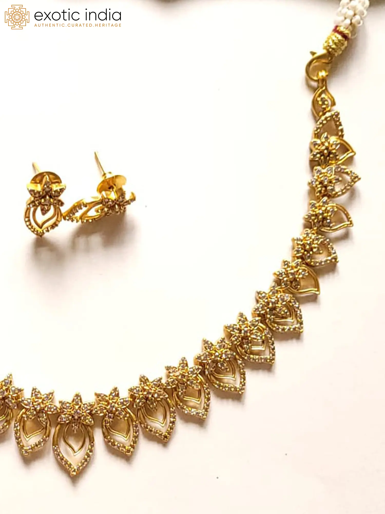 This Brass Attractive White Flower Mango Necklace with Earrings is a regal masterpiece, seamlessly blending elegance and tradition. The intricate design features a white flower embellished with CZ stones gracefully placed over a mango motif. This fusion of the floral and mango elements creates a harmonious visual symphony, symbolizing beauty and prosperity.