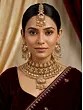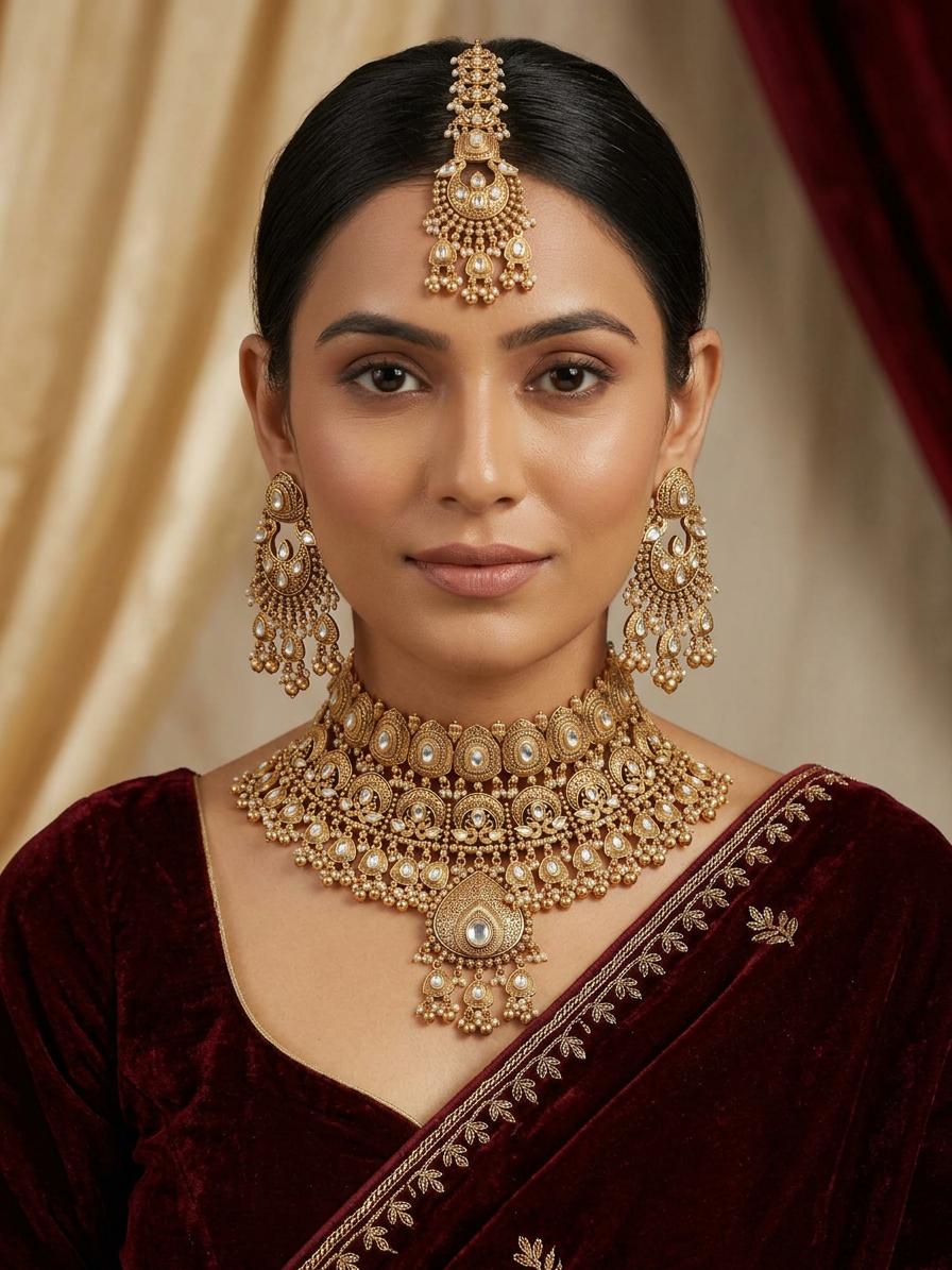 The accompanying earrings echo the design motifs of the necklace, creating a harmonious and balanced ensemble. Their intricate carvings and elegant shape mirror the grandeur of the central piece, offering a cohesive look that exudes sophistication. These earrings are designed to frame the face beautifully, enhancing the bride's natural features and adding a touch of refined glamour. Completing this stunning set is the Mangtika, a traditional head ornament that holds deep cultural significance. Its design flawlessly complements the necklace and earrings, featuring similar carvings and embellishments that tie the entire look together. The Mangtika gracefully adorns the forehead, adding a final touch of regal charm to the bride's ensemble. It is designed for comfort and secure placement, allowing the bride to move with ease and confidence. This jewelry set is not just an accessory; it's an heirloom-worthy piece that can be treasured for generations. It is designed to make the bride feel radiant and confident, creating memories that will last a lifetime.