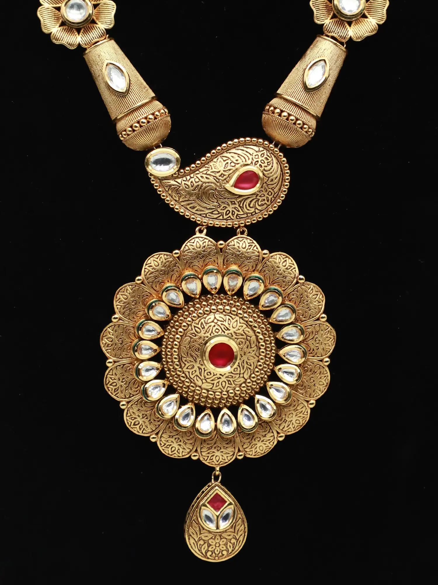 This necklace and earring set draws inspiration from the timeless artistry of Indian jewelry. The intricate patterns, the use of Kundan stones, and the overall design evoke a sense of cultural heritage and timeless beauty. It’s a perfect choice for those who appreciate the artistry of traditional jewelry.