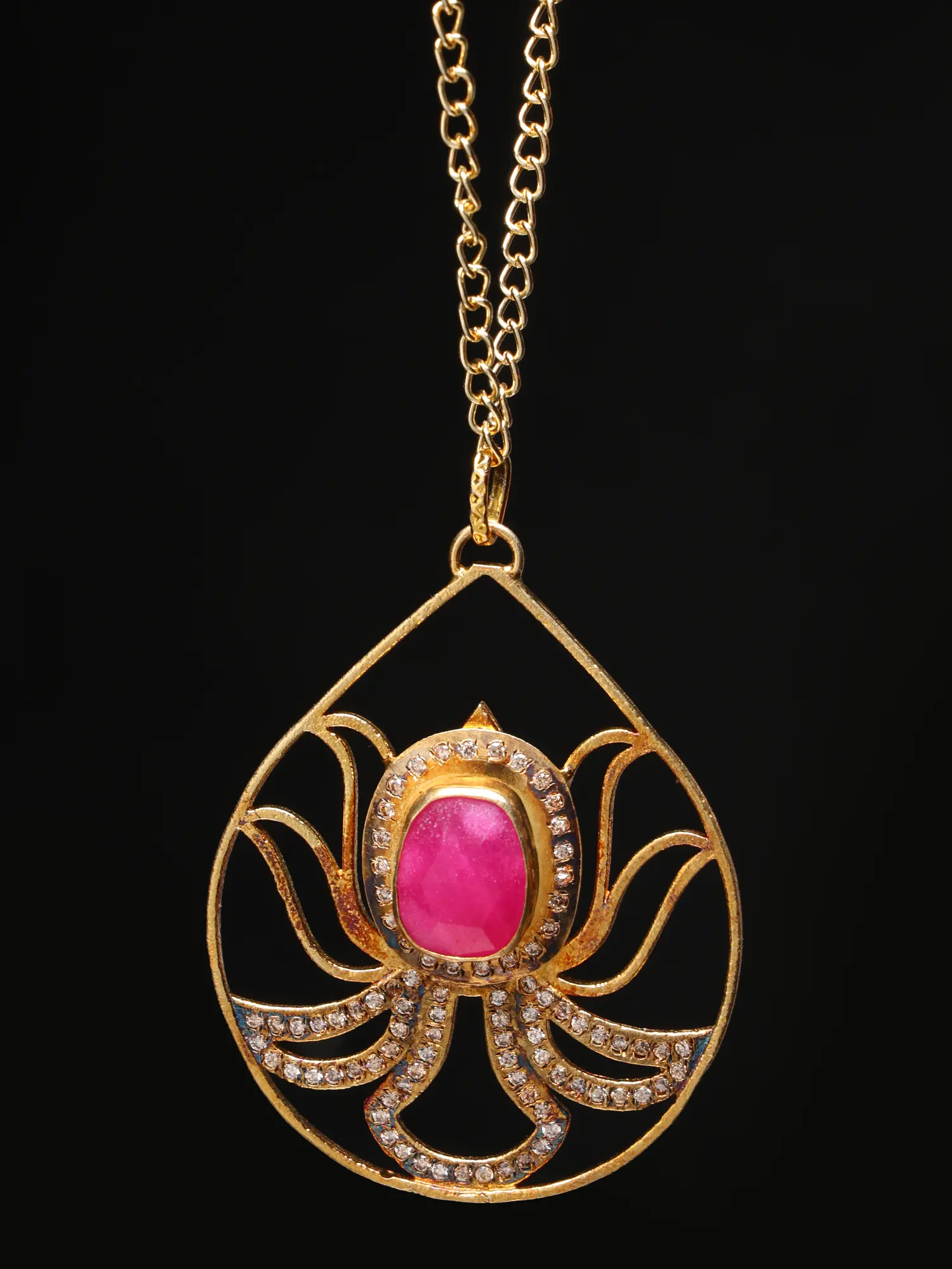 Brass Lotus In Tear Drop Shape Pendant with Ruby and CZ