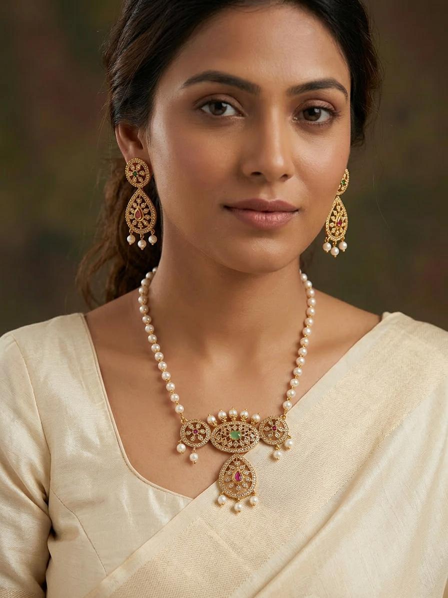 The necklace appears delicate, with pink and green stones set in metal, adding a regal and feminine charm.