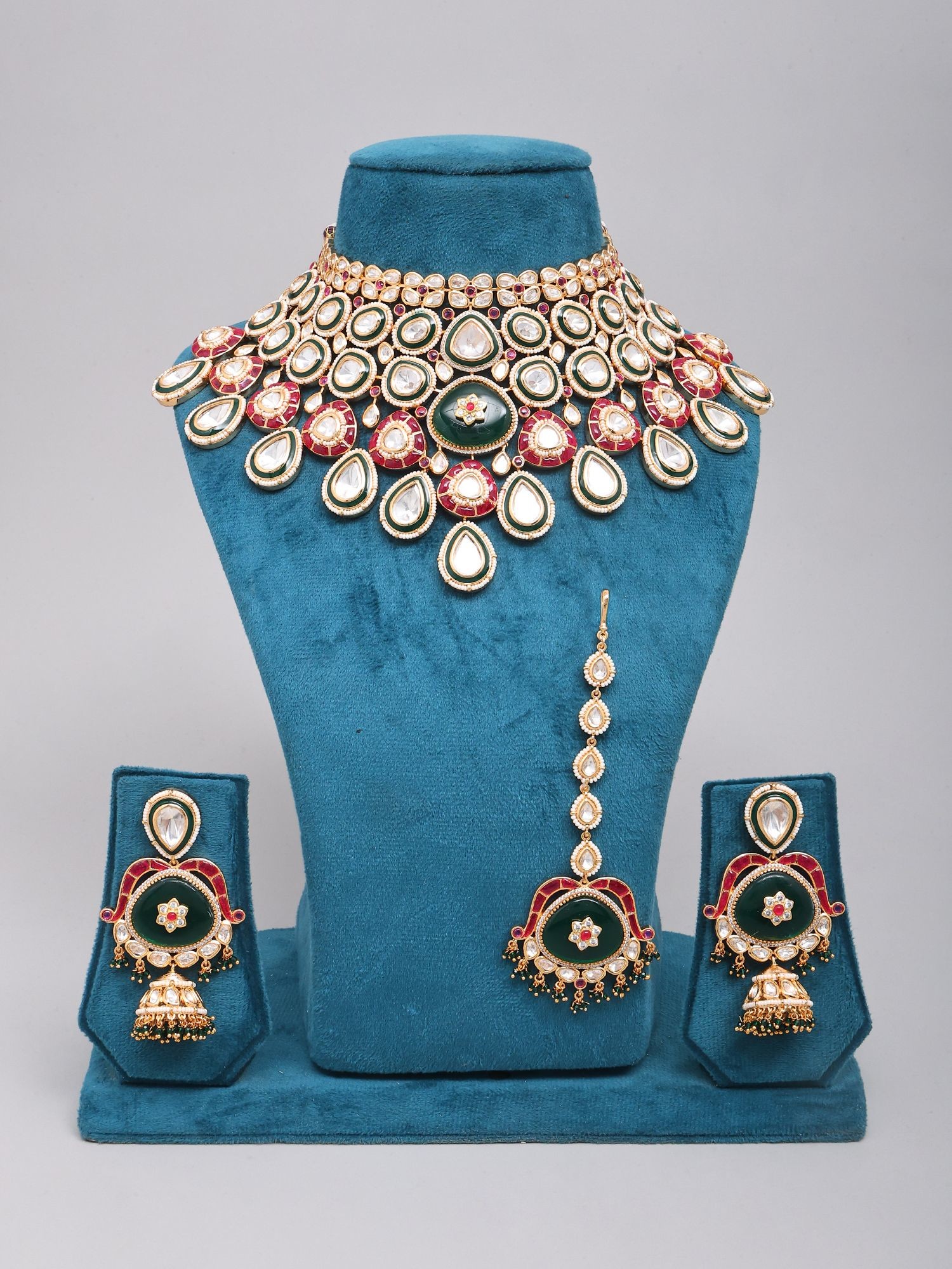 The set includes a statement choker necklace, a forehead ornament (maang tikka), and a pair of earrings.