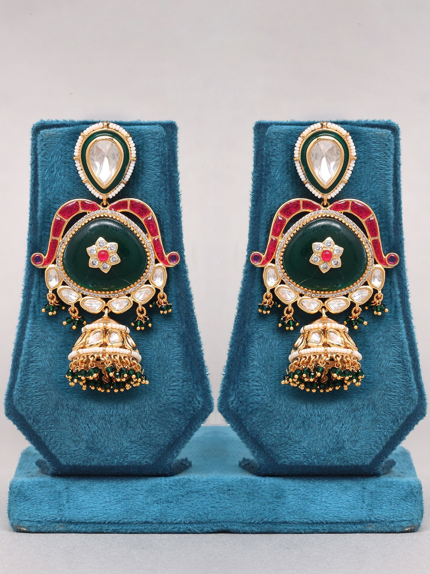 Matching jhumka earrings designed with green centers, red accents, and dangling pearl beads.