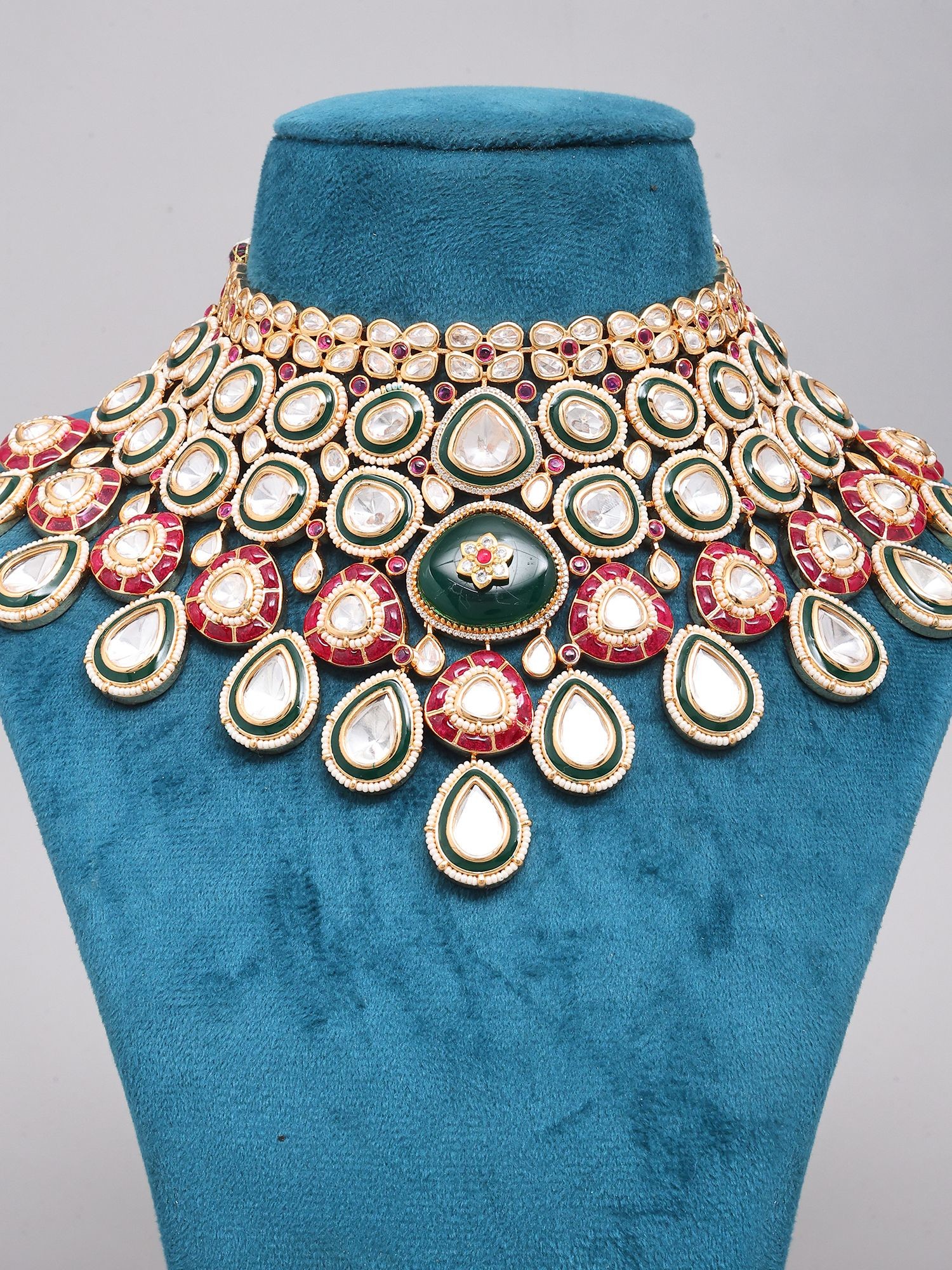 Elaborate choker necklace featuring intricate green Kundan stone work and teardrop-shaped white stones.