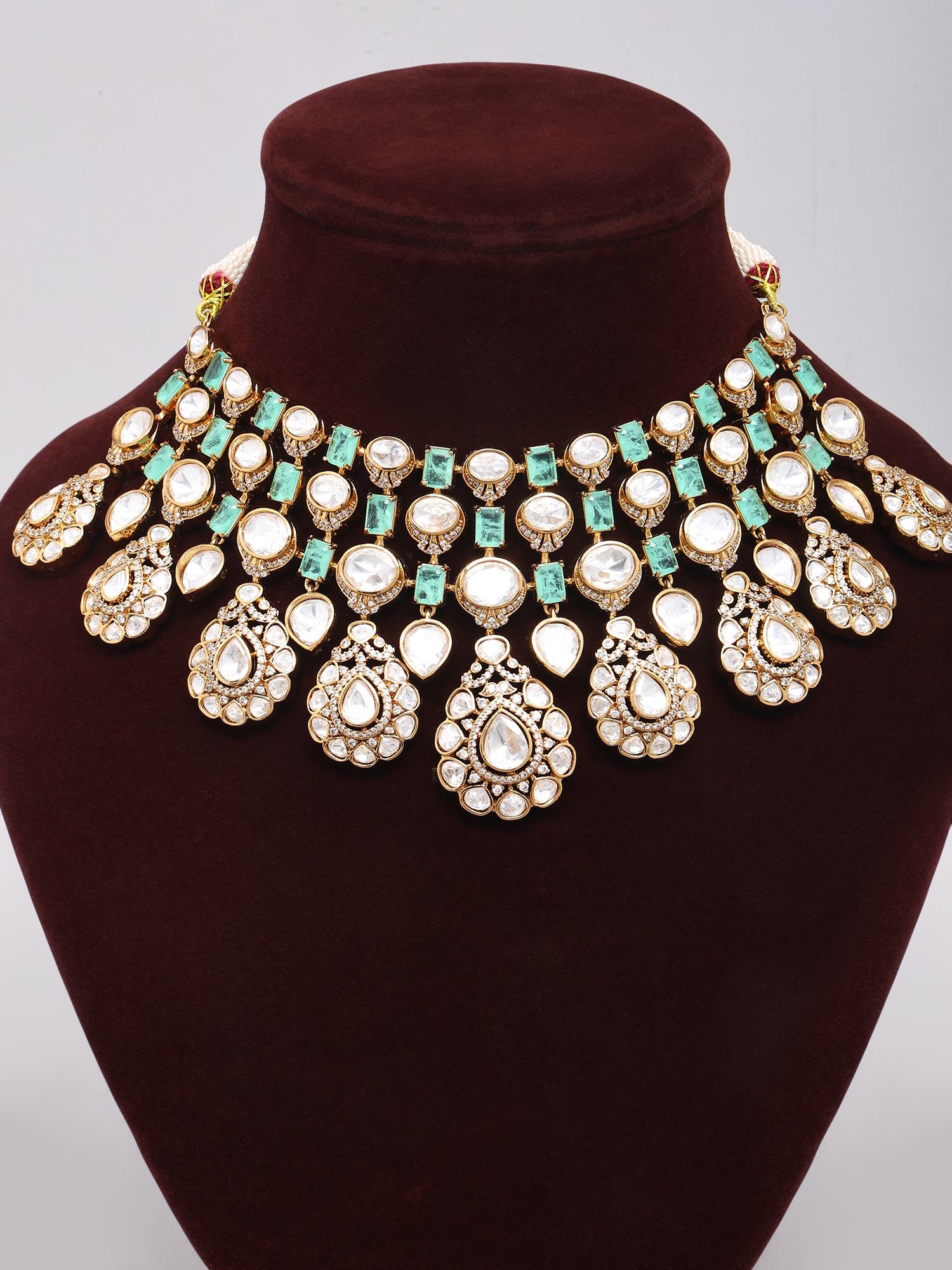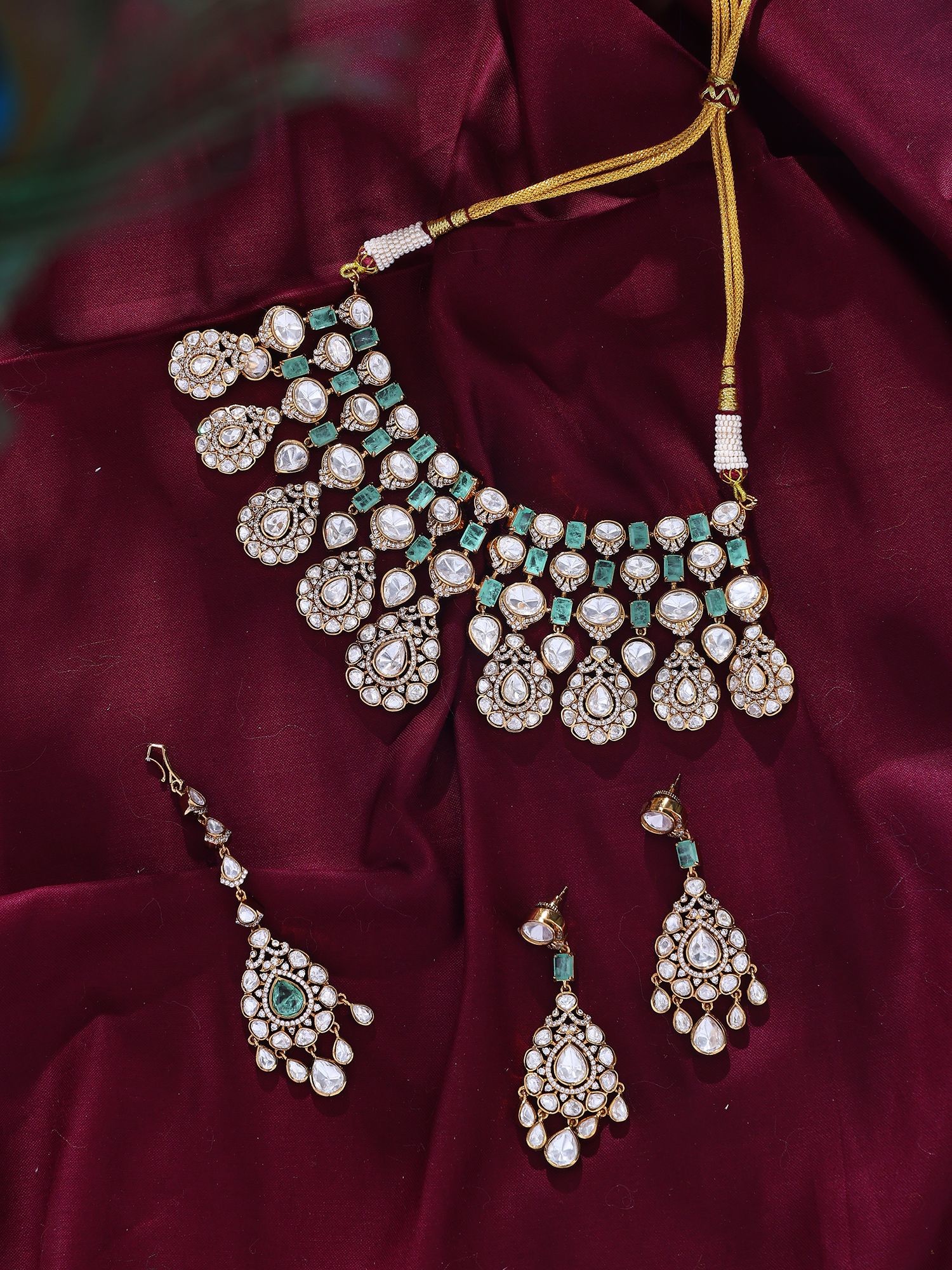 Emerald & Polki Stone Studded Choker Necklace Set with Maang Tikka