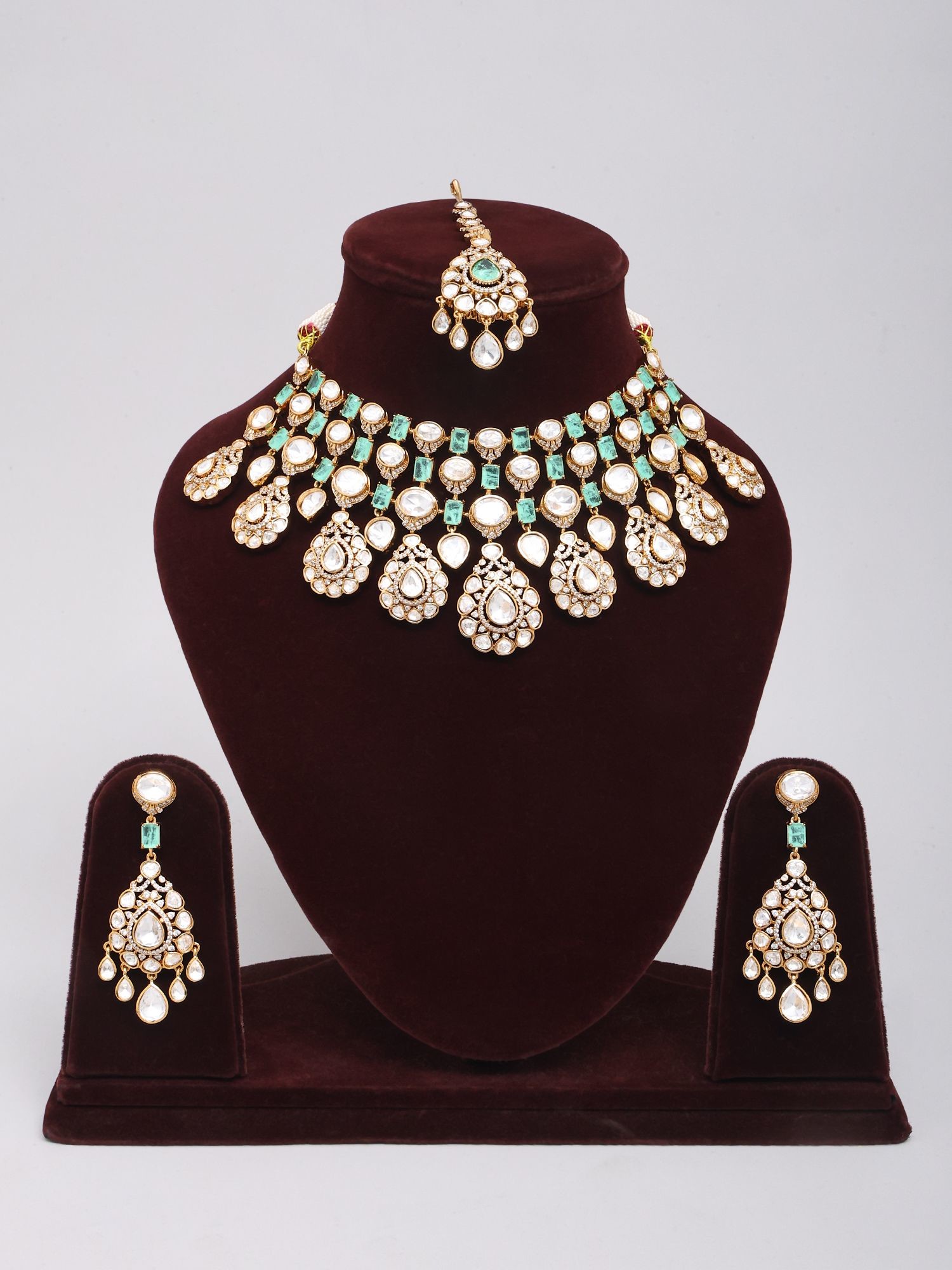Complete Bridal Choker Set: Pear Shape Polki Necklace, Earrings, and Maang Tikka