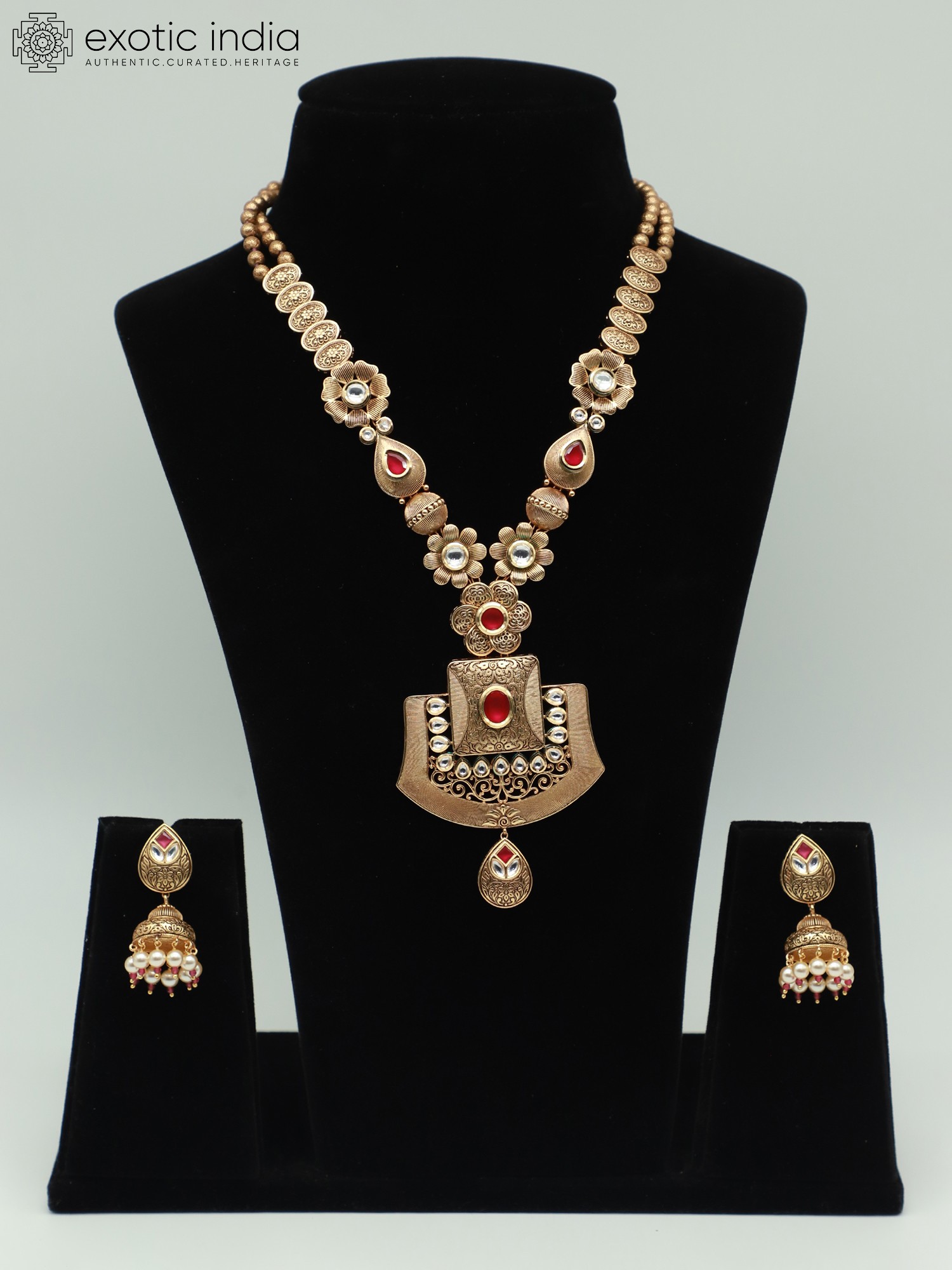 The necklace features a carefully crafted pendant, showcasing the beauty of Kundan artistry. The pendant's shape is eye-catching and bold, with the red stones adding a touch of vibrancy and depth to the piece. Small beads and floral motifs connect the pendant to the rest of the necklace. The earrings echo the design elements of the pendant, creating a harmonious and balanced look. They are the perfect size, not too heavy, allowing you to wear them comfortably for extended periods. Delicate pearl accents finish the earrings, adding a subtle touch of femininity.