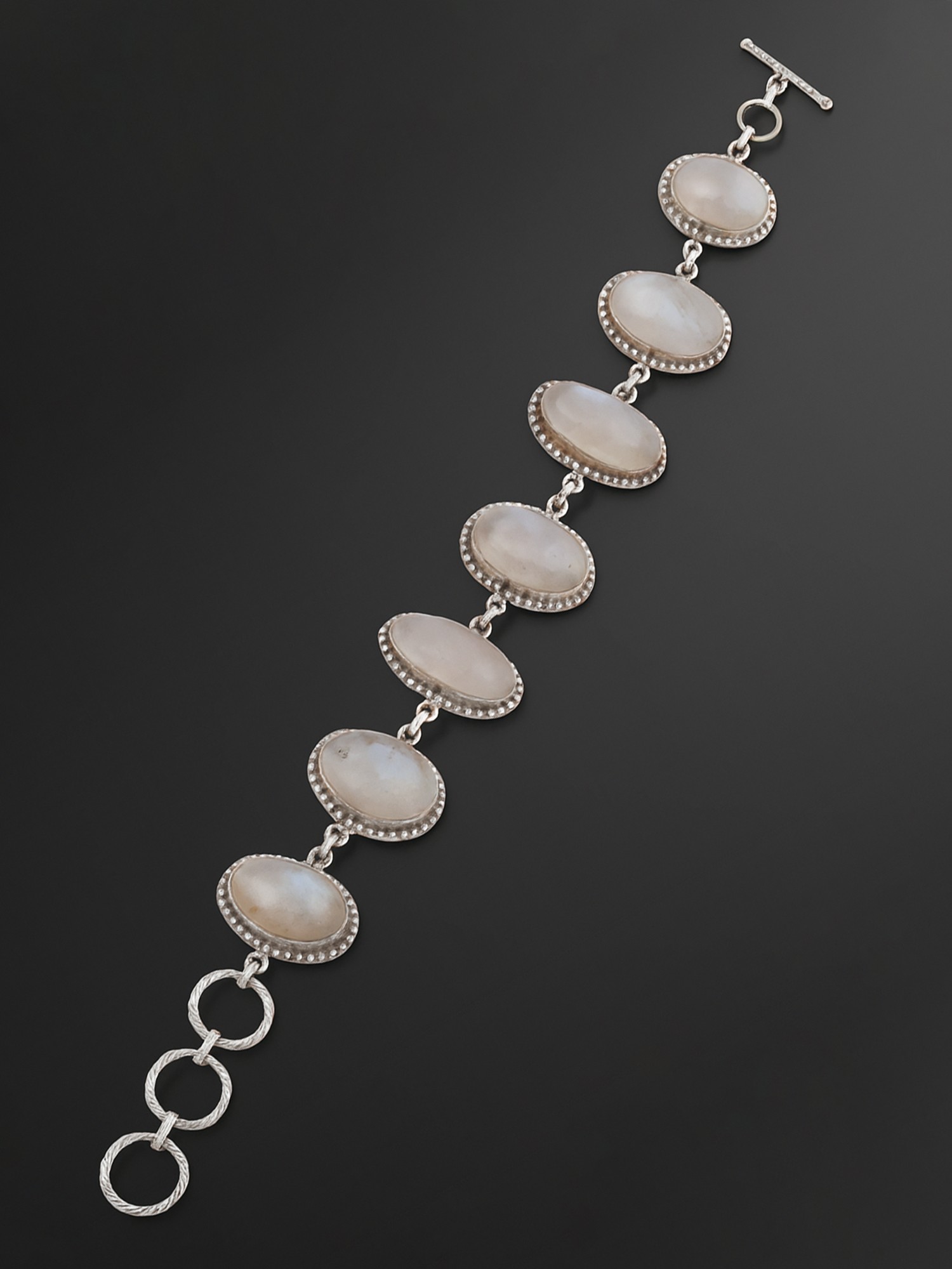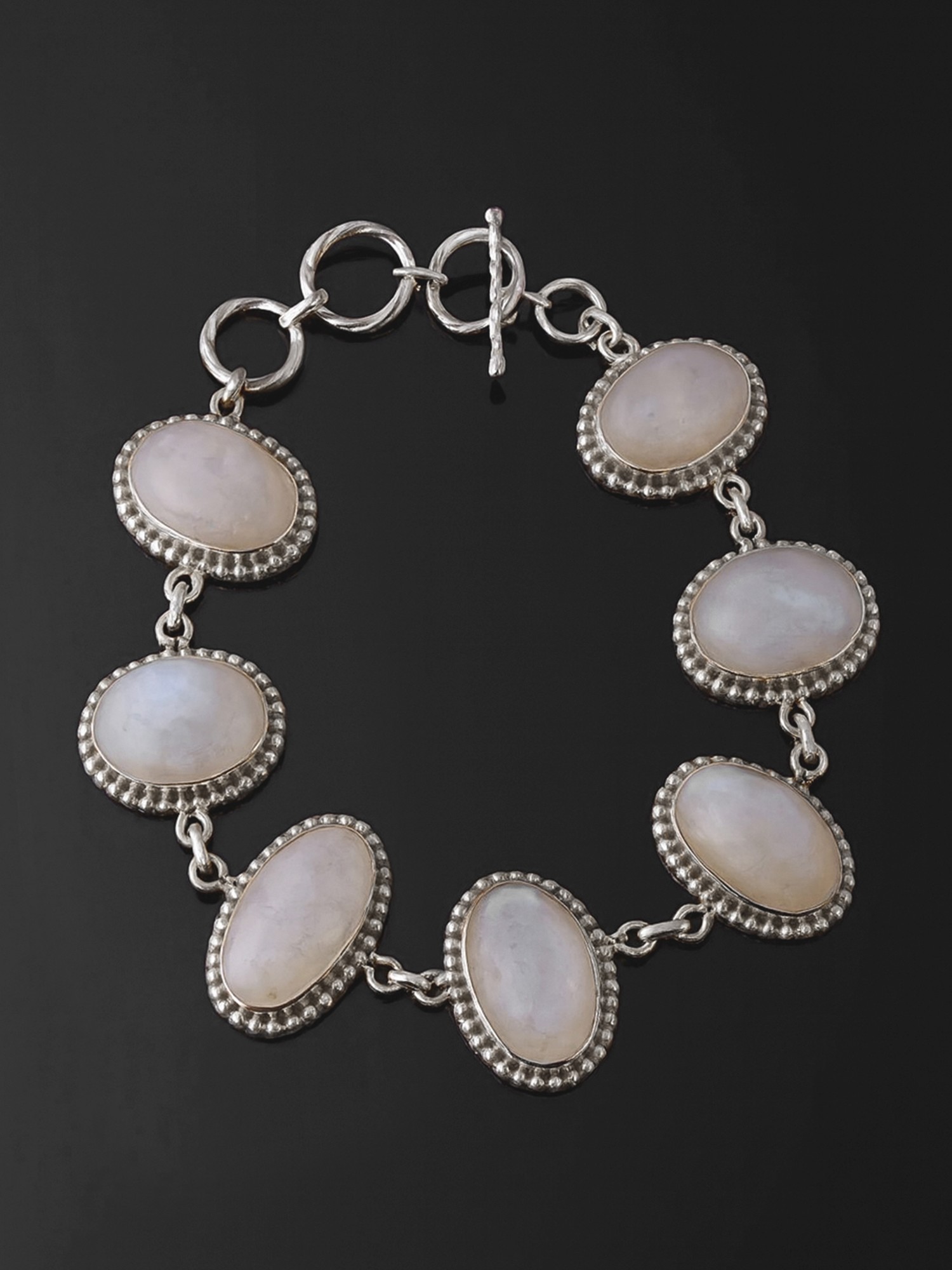 Chandra is also sometimes called Indu which translates to Bright Drop. Embodying the brightest drop from the moon is this Cabochon Rainbow Moonstone Studded bracelet. Indians often wear a lot of jewelry. These pieces are worn on special occasions, as a status symbol, and even as a way to enhance one’s appearance. But dig a deep deeper and some will find the need to wear jewelry as a means to keep in touch with their spiritual self. Traditionally, women who wear bracelets stack them up and make command attention just by the sound of bracelets clanking together. This moonstone studded bracelet can do just that: let people know you’re in the room in style. This necklace features a beautiful set of cabochon gemstones laid on top of sterling silver bases with a toggle clasp. It captures Chandra’s charm as the lunar deity.