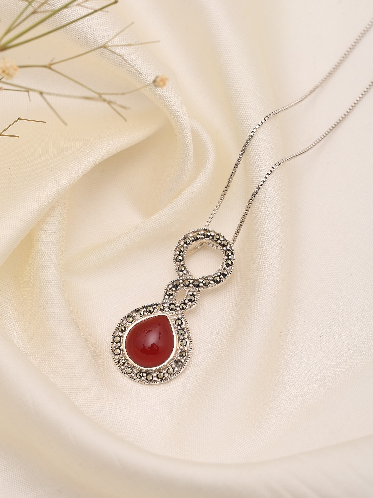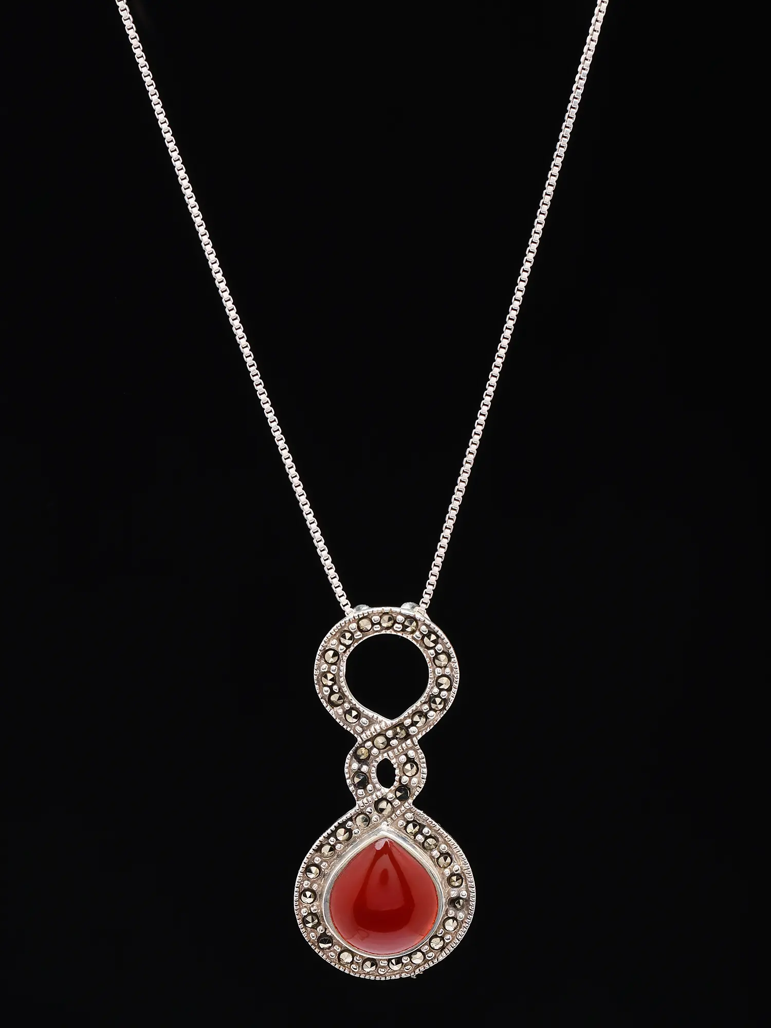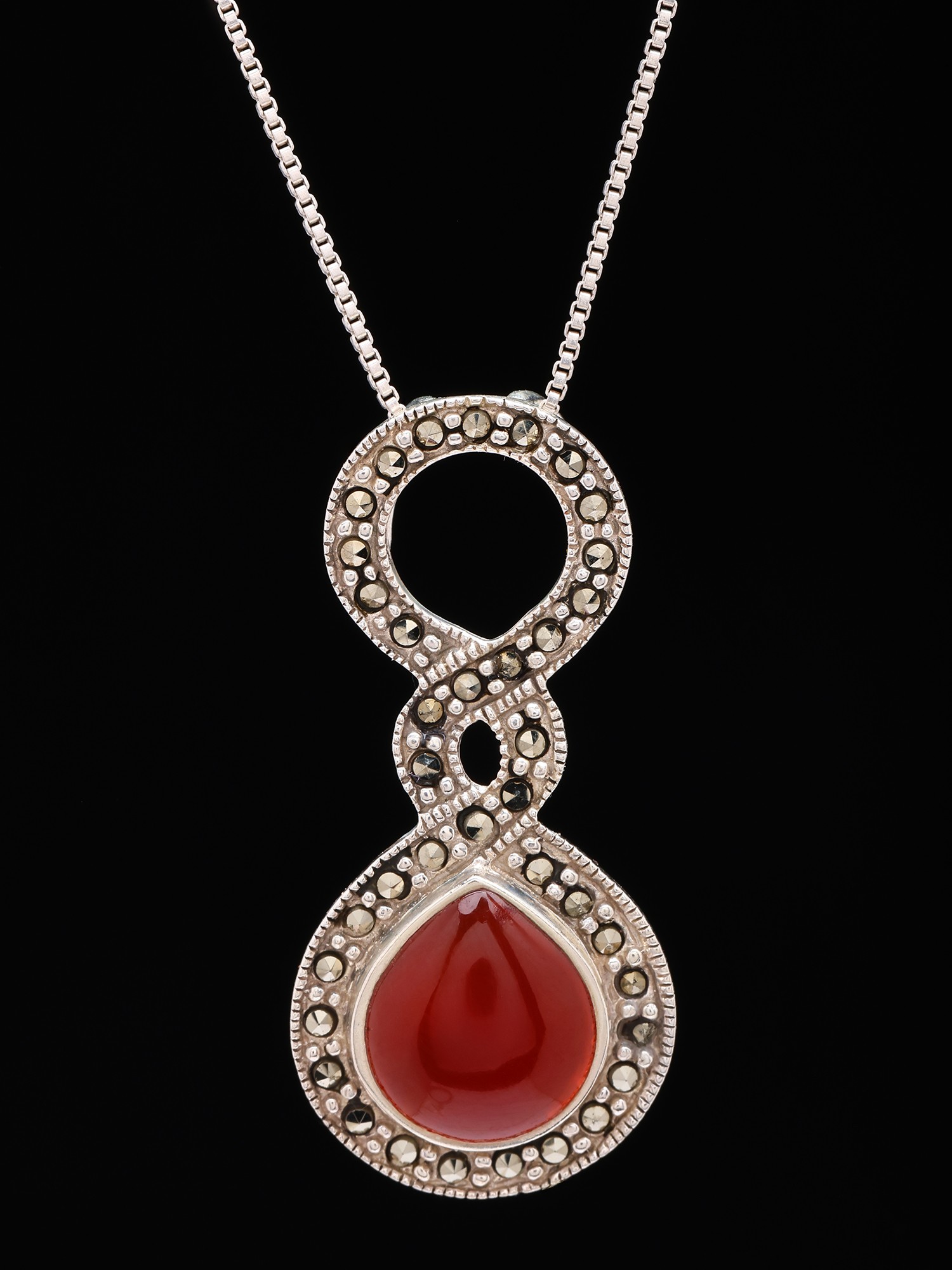 The intricate infinity-like setting of the silver and marcasite adds a unique design element.
