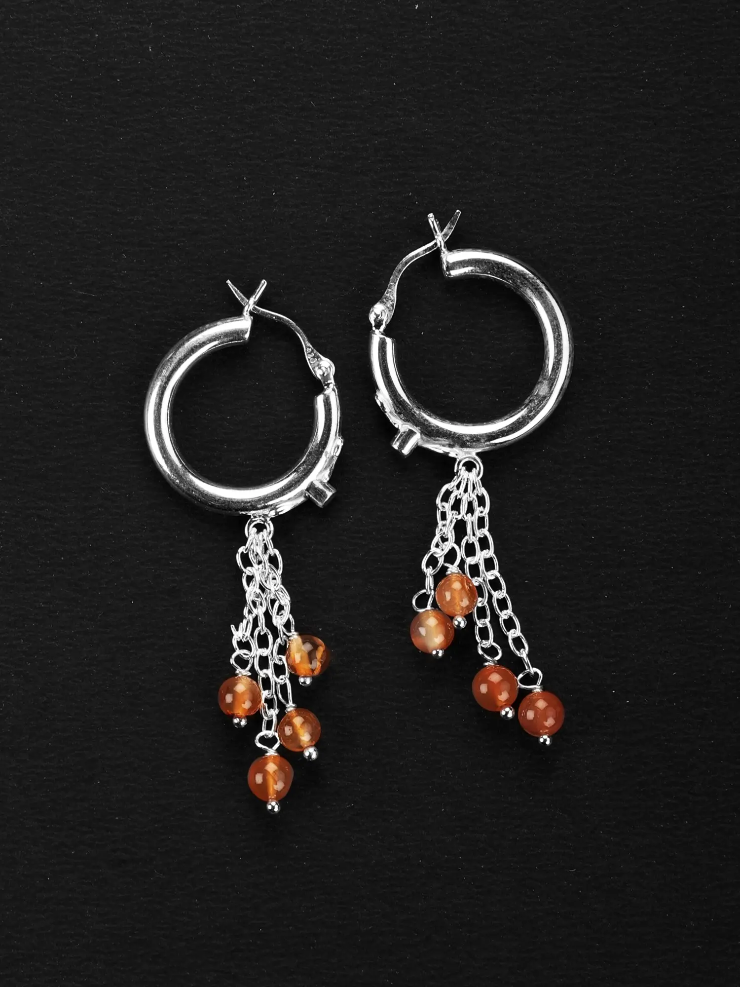 The Carnelian Hoop Chandeliers are a dance of fire and metal, a blend of vigor and fluidity. Suspended from sterling silver hoops, delicate chains drape gracefully, each ending in a glowing carnelian bead. These vibrant stones carry the warmth of a summer sunset, their rich, orange tones believed to bolster courage and vitality. Carnelian, a stone of motivation and endurance, adds not just beauty but also an essence of empowerment to these earrings. Crafted for those who carry the spirit of the fire, these chandeliers are not mere ornaments; they are a celebration of life's passionate rhythm. Wear them and feel the pulse of ancient strength and contemporary elegance.