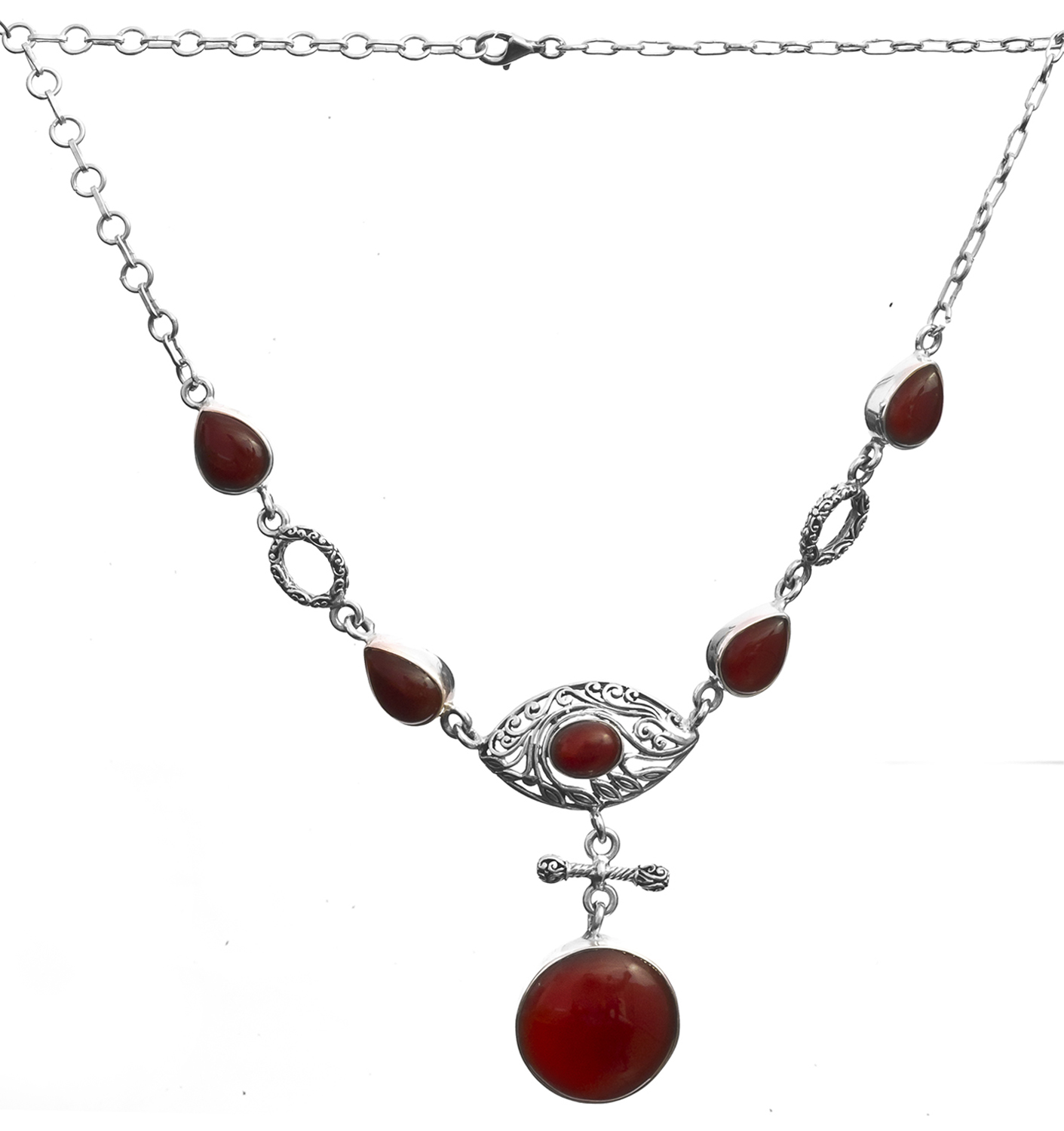 The centerpiece is a captivating, deep-hued carnelian cabochon, a smooth orb that draws the eye with its rich, fiery glow. This statement piece is complemented by elegantly shaped carnelian teardrops, strategically placed to enhance its dynamic silhouette. The 17-inch sterling silver chain forms a perfect embrace, leading to a stunning 2.3-inch overhang that creates a mesmerizing visual cascade.