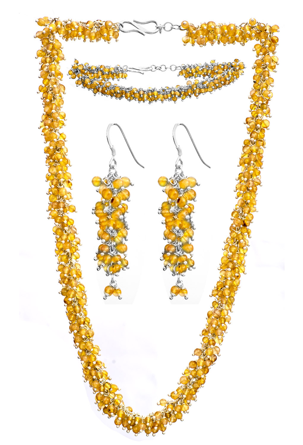 The necklace gracefully drapes at 16.5 inches, forming a cascade of warm, inviting color. Complementing this, the earrings suspend beautifully, each measuring approximately 2 inches in height, offering a subtle yet striking accent. Completing the set, a delicate bracelet, 7 inches in length, wraps elegantly around your wrist, harmonizing the entire look. The rich, honeyed tones of the precisely cut stones are amplified by their clustered arrangement, creating a captivating visual texture.