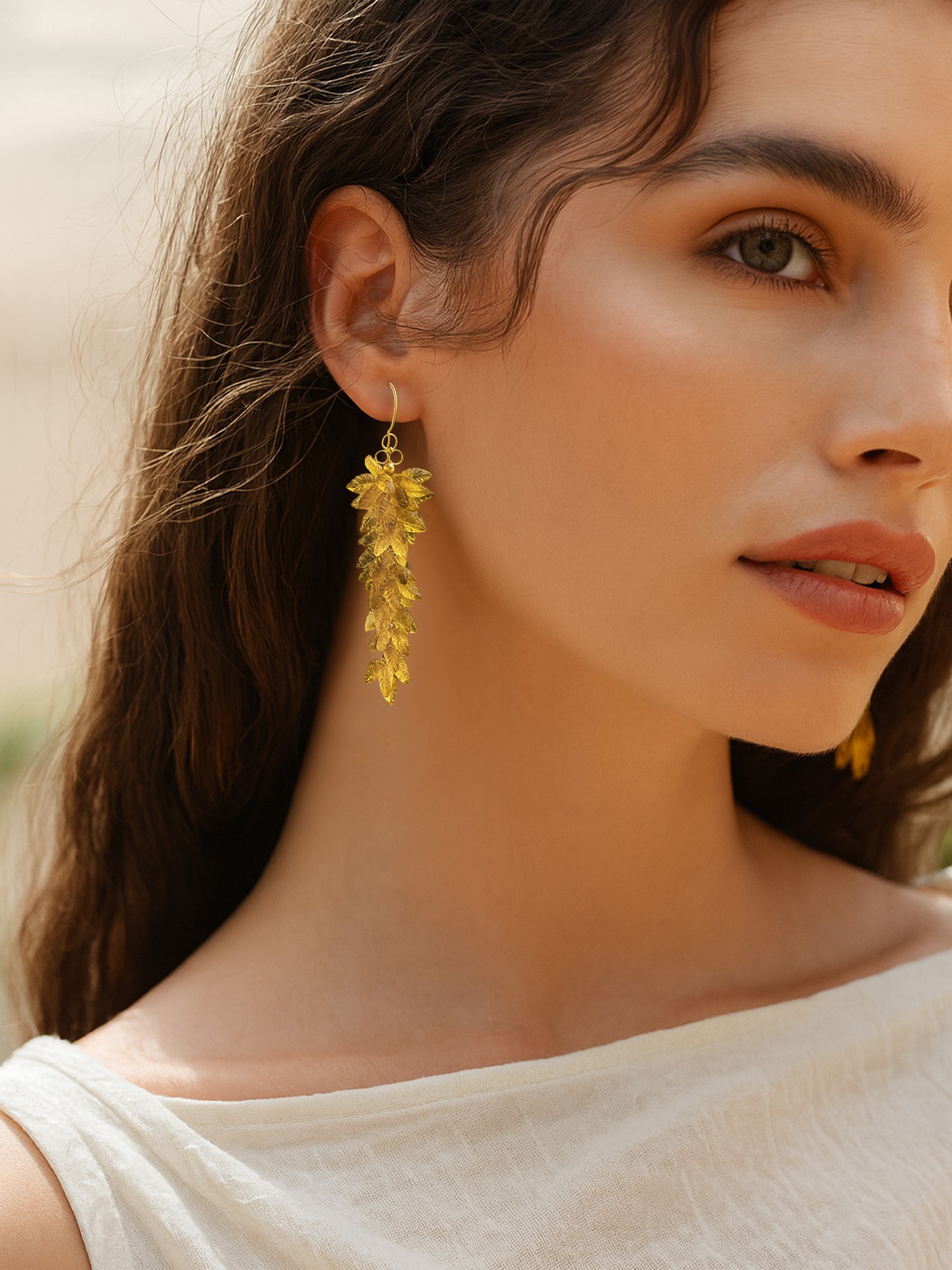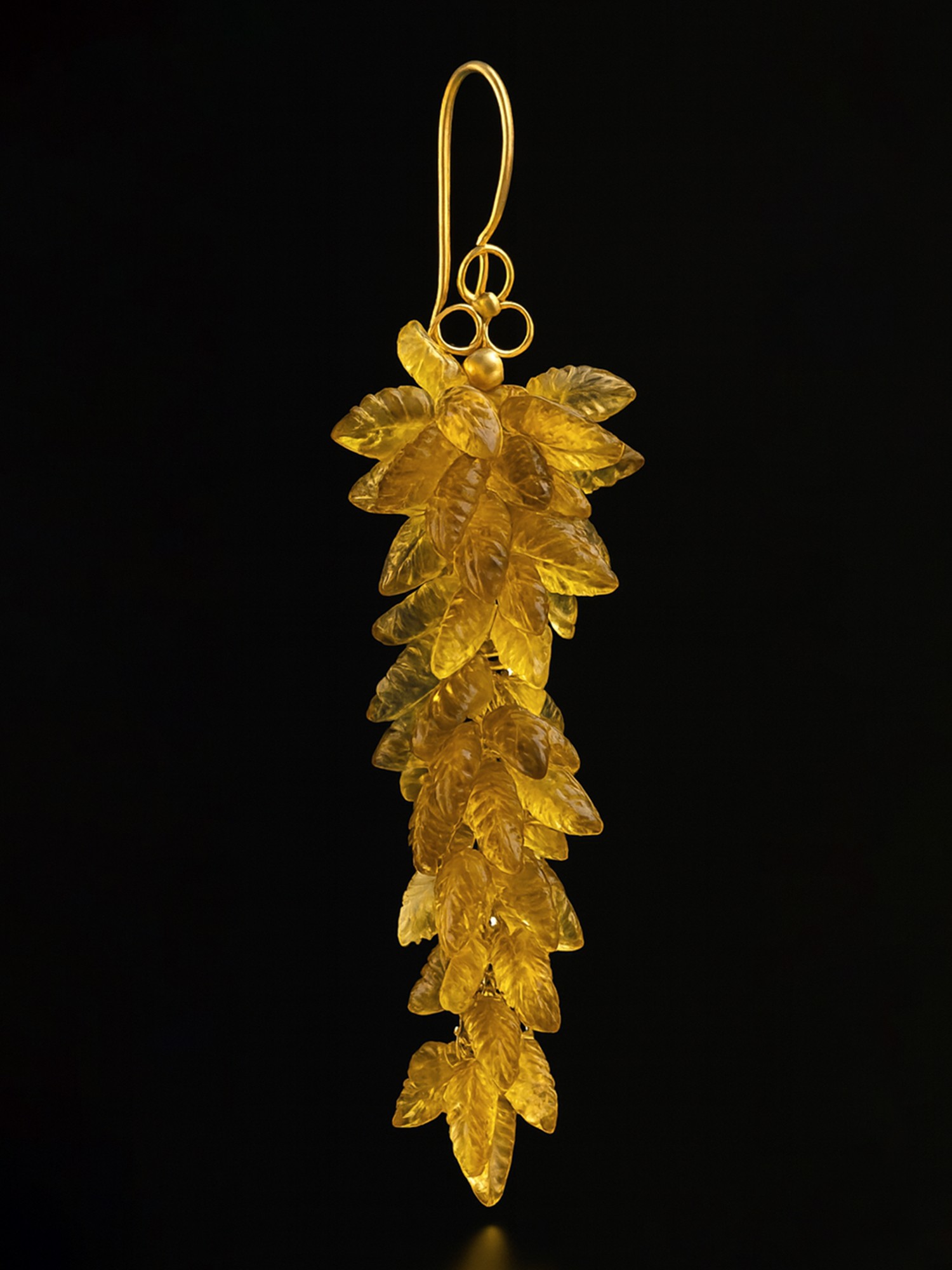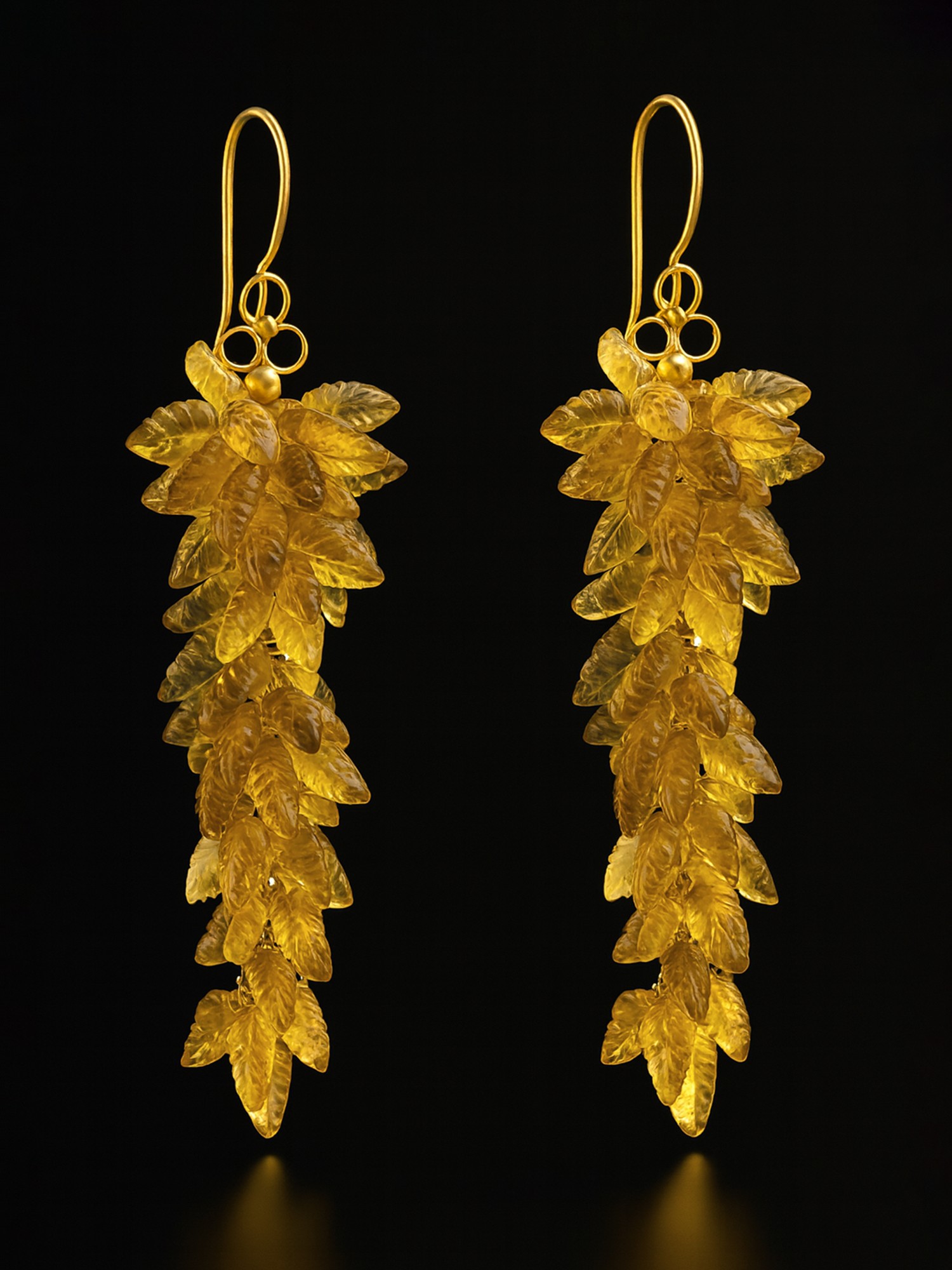 The Carved Citrine Leaves Bunch Earrings are a celebration of nature's perennial beauty. Fashioned into delicate leaves, the radiant citrine gemstones dangle gracefully, their golden hues reminiscent of autumn's charm. The intricate carving captures the essence of fall's foliage, each leaf a testament to the meticulous craftsmanship and the glory of the changing seasons.