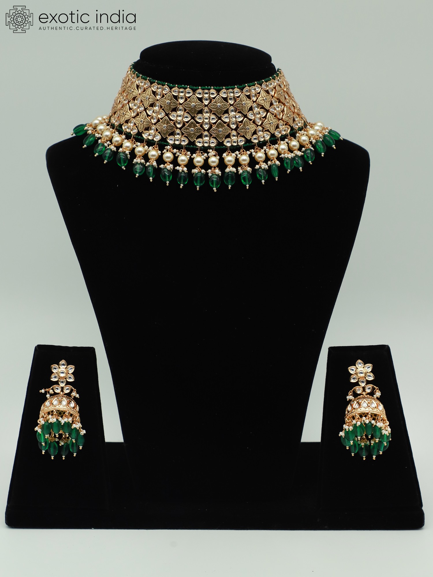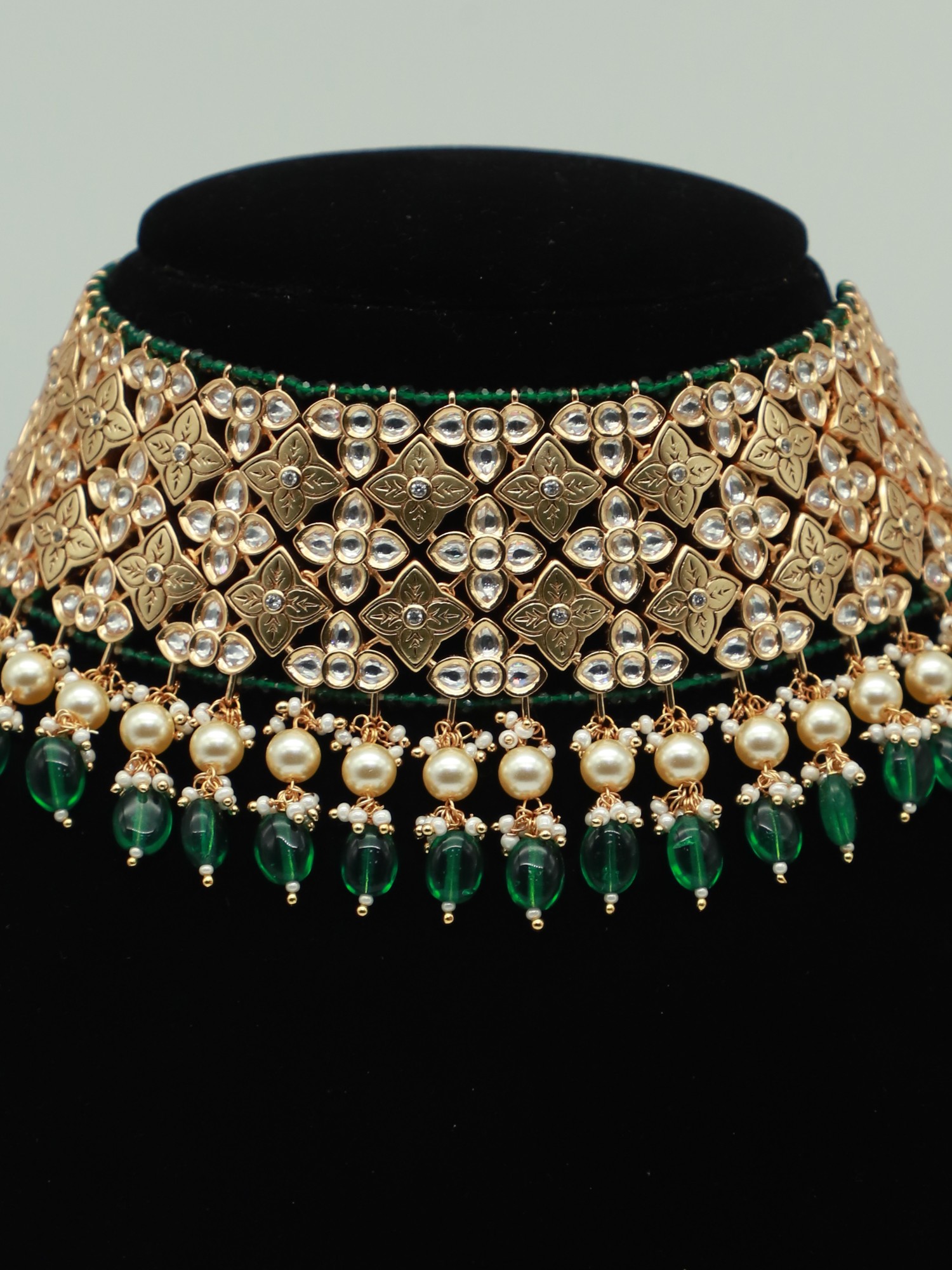 The necklace showcases a captivating choker design, sitting gracefully against the neck. The intricate pattern is adorned with shimmering accents, catching the light with every movement. A delicate strand of drop beads, featuring a combination of vibrant green and creamy white pearls, dangles elegantly from the lower edge, adding a touch of fluidity and charm. This blend of textures and colors creates a harmonious balance, making the necklace a true statement piece.