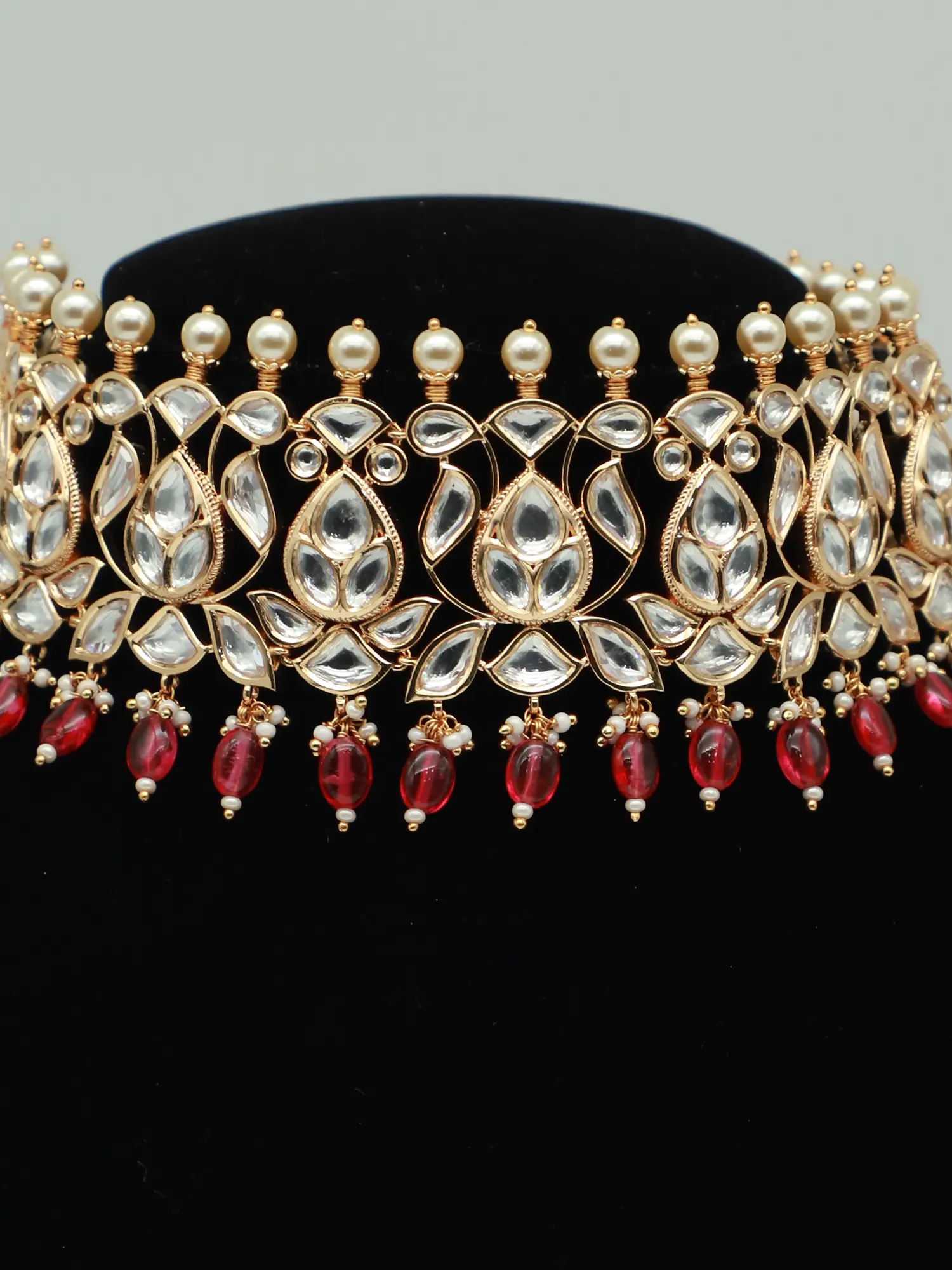 Red Handloom Fabric Choker Set with Pearl & Stone Embellishments
