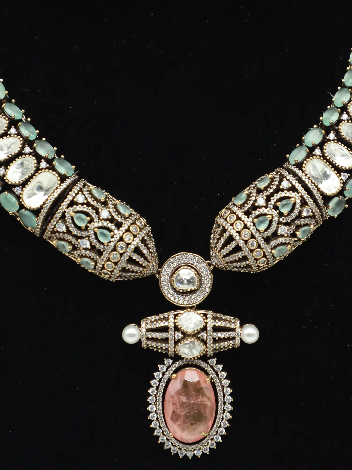 The accompanying earrings echo the design of the necklace, providing a cohesive and balanced look. Each earring mirrors the pendants design, featuring its own radiant gemstone at its center. The earrings dangle gracefully, catching the light with every movement. The combination of the necklace and earrings creates a complete set that is perfect for special occasions, weddings, or any event where you want to make a lasting impression.