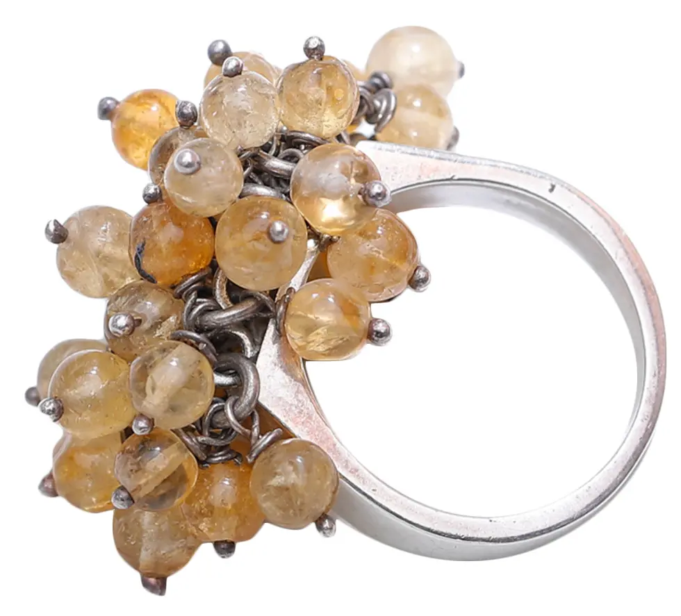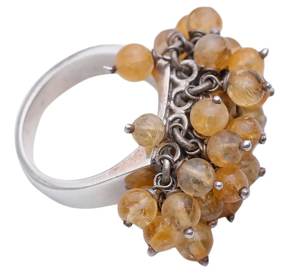 This gemstone is not only cherished for its vibrant color but also for its supposed ability to attract wealth and prosperity. It's also said to encourage generosity, sharing its abundance in a cycle of giving and receiving. The ring's design, with citrine orbs nestled in an intricate silver setting, speaks to the free spirit and creativity, which the stone is thought to enhance. This piece is more than an ornament- it is a bearer of joy and a talisman for success in new ventures.