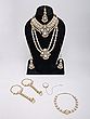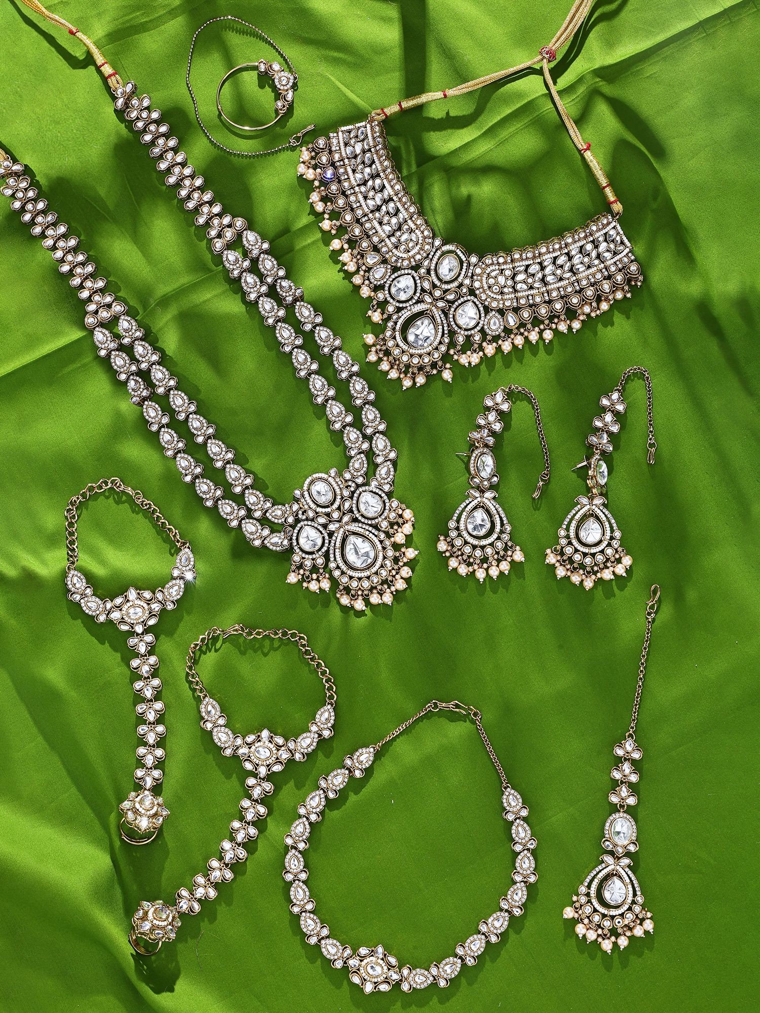 Includes a comprehensive set of necklaces, earrings, bracelets, and headpiece for a complete bridal look.