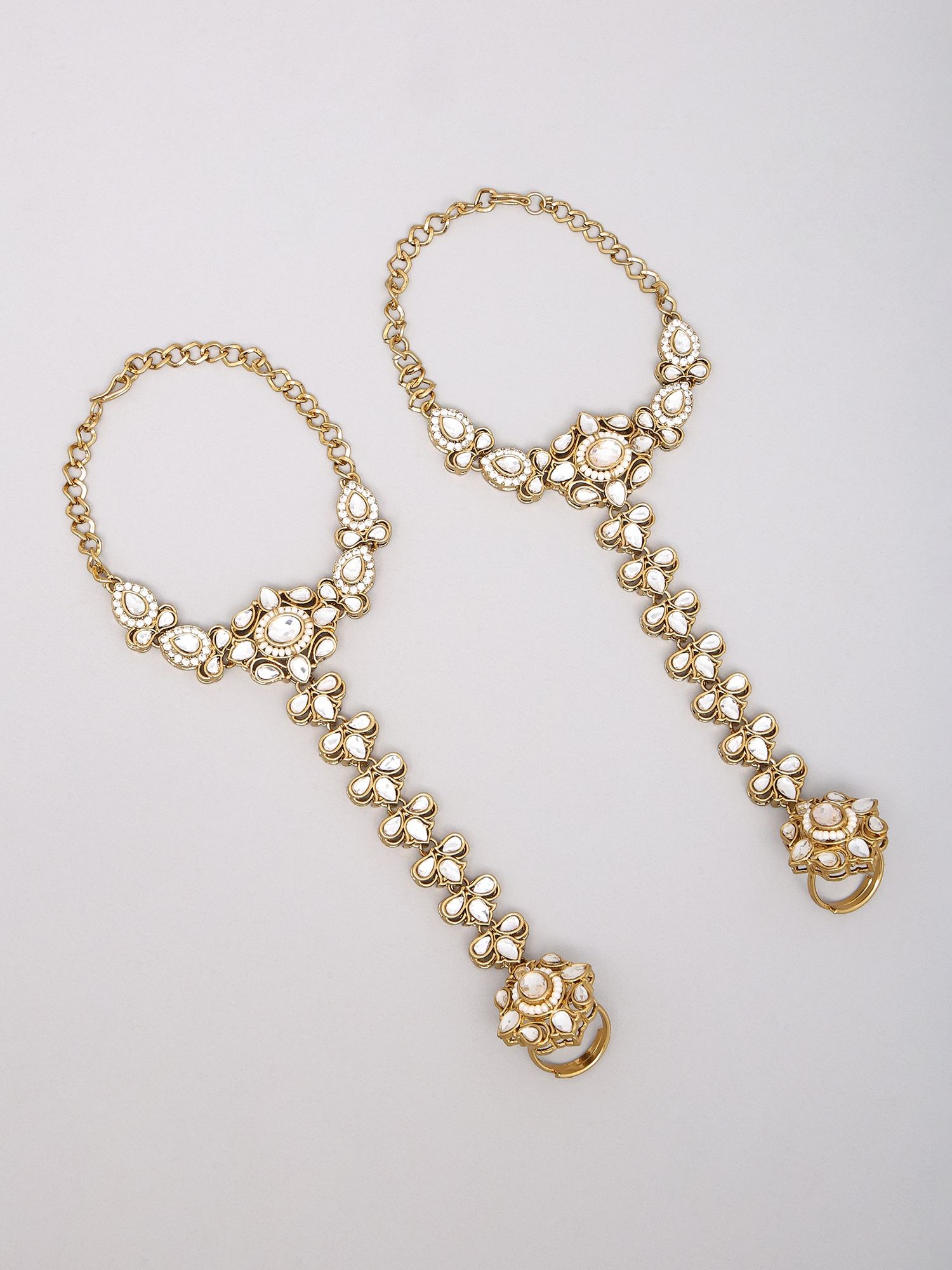 Adorned with meticulously placed Polki stones and simulated pearls for a luminous effect.