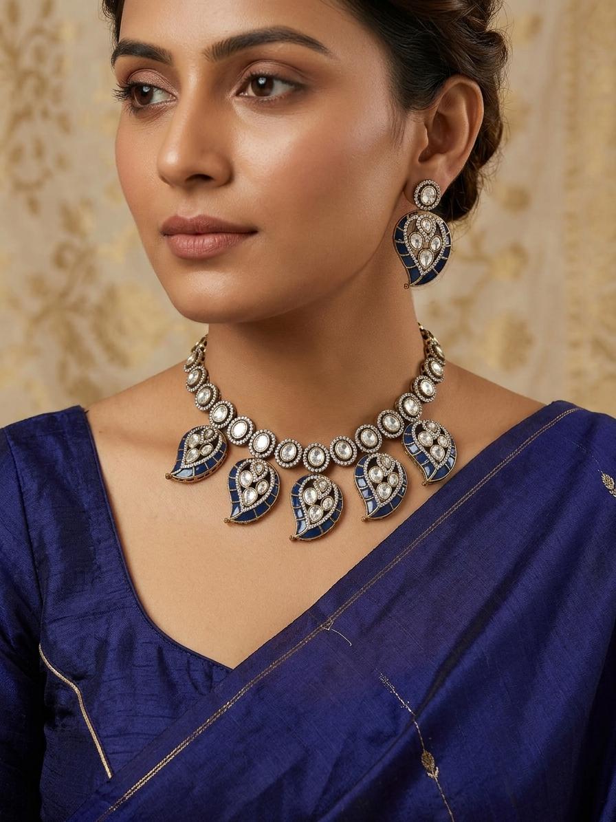 Adorn yourself in the captivating allure of our exquisite Copper and Kundan necklace set, a masterpiece of craftsmanship that seamlessly blends traditional artistry with modern elegance. This stunning set is more than just jewelry; it's a statement piece, a reflection of your unique style, and a celebration of timeless beauty. The rich, deep blue enamel beautifully complements the shimmering Kundan stones, creating a mesmerizing contrast that will surely turn heads. This necklace set is perfect for adding a touch of regal sophistication to your special occasion attire.