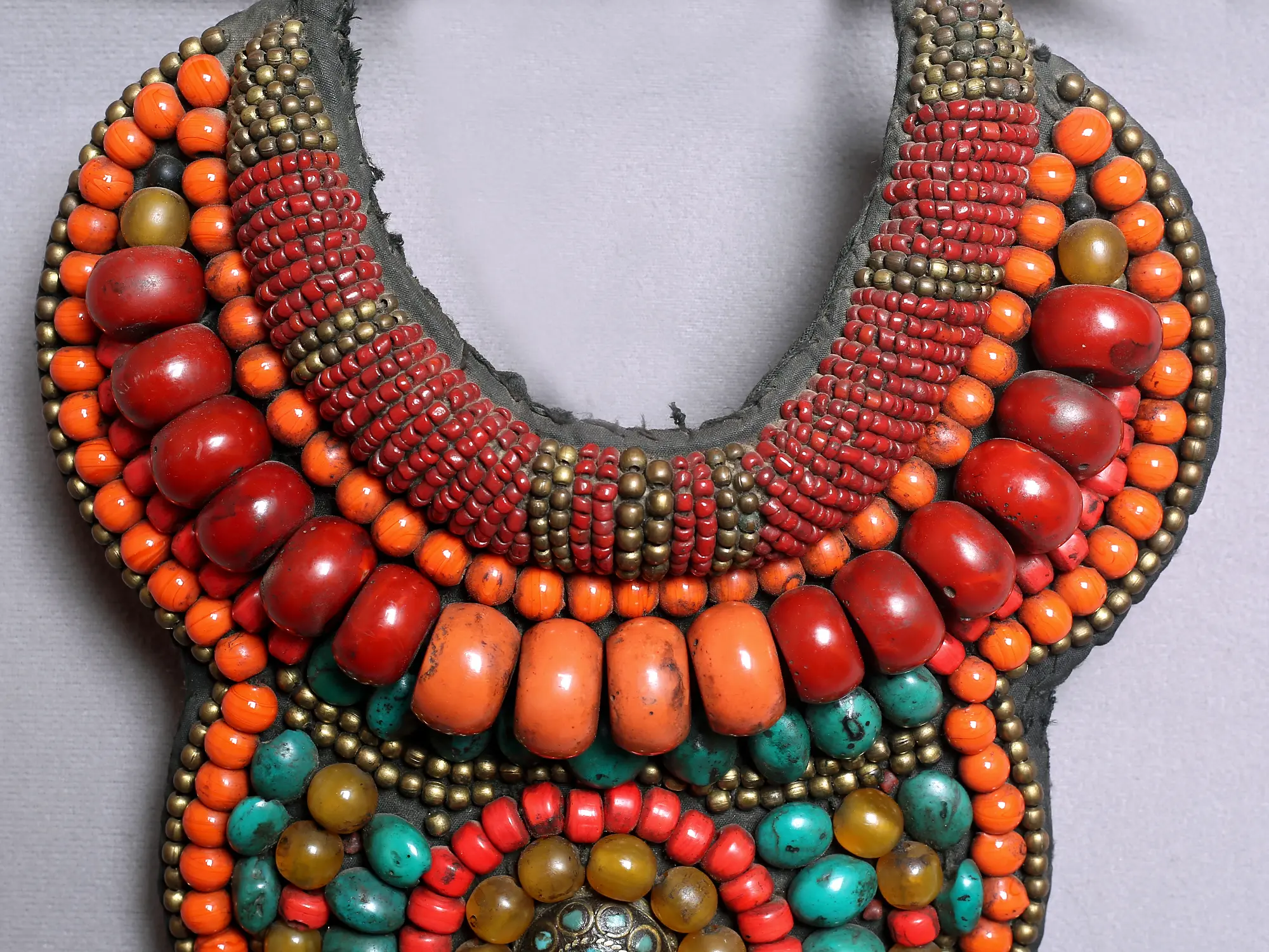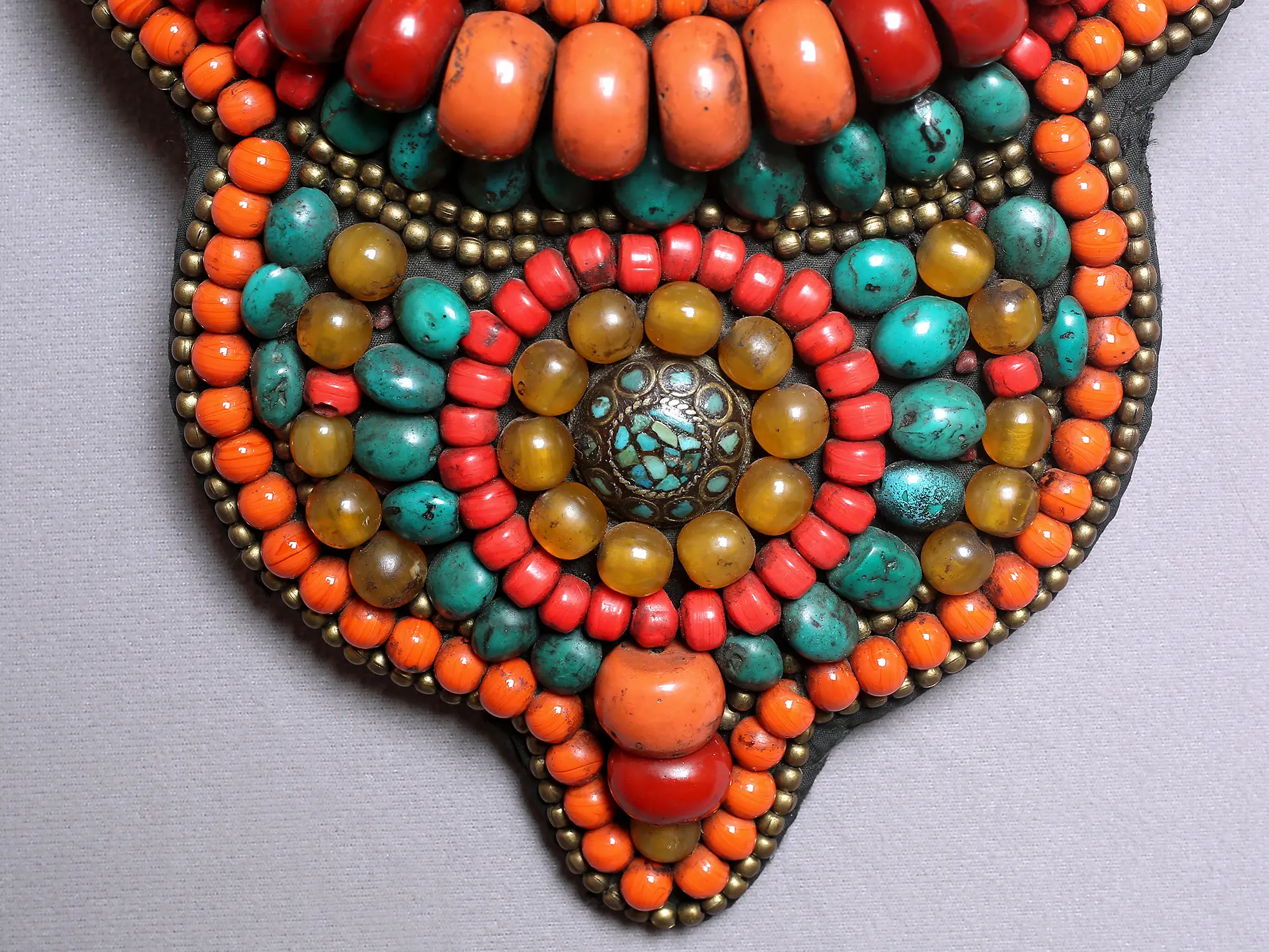 Ladakhi Kebuks are traditional necklaces from the land of Monastries that are worn by native women during special occasions. This Coral & Turquoise Stone Necklace from Ladakh is a traditional Kebuk. Handcrafted with Ladakhi finesse, vibrant coral and turquoise stones intertwine like tales of Himalayan landscapes. Each stone, a testament to the earth's artistry, is carefully set on a cloth base, reflecting Ladakh’s traditional craftsmanship.