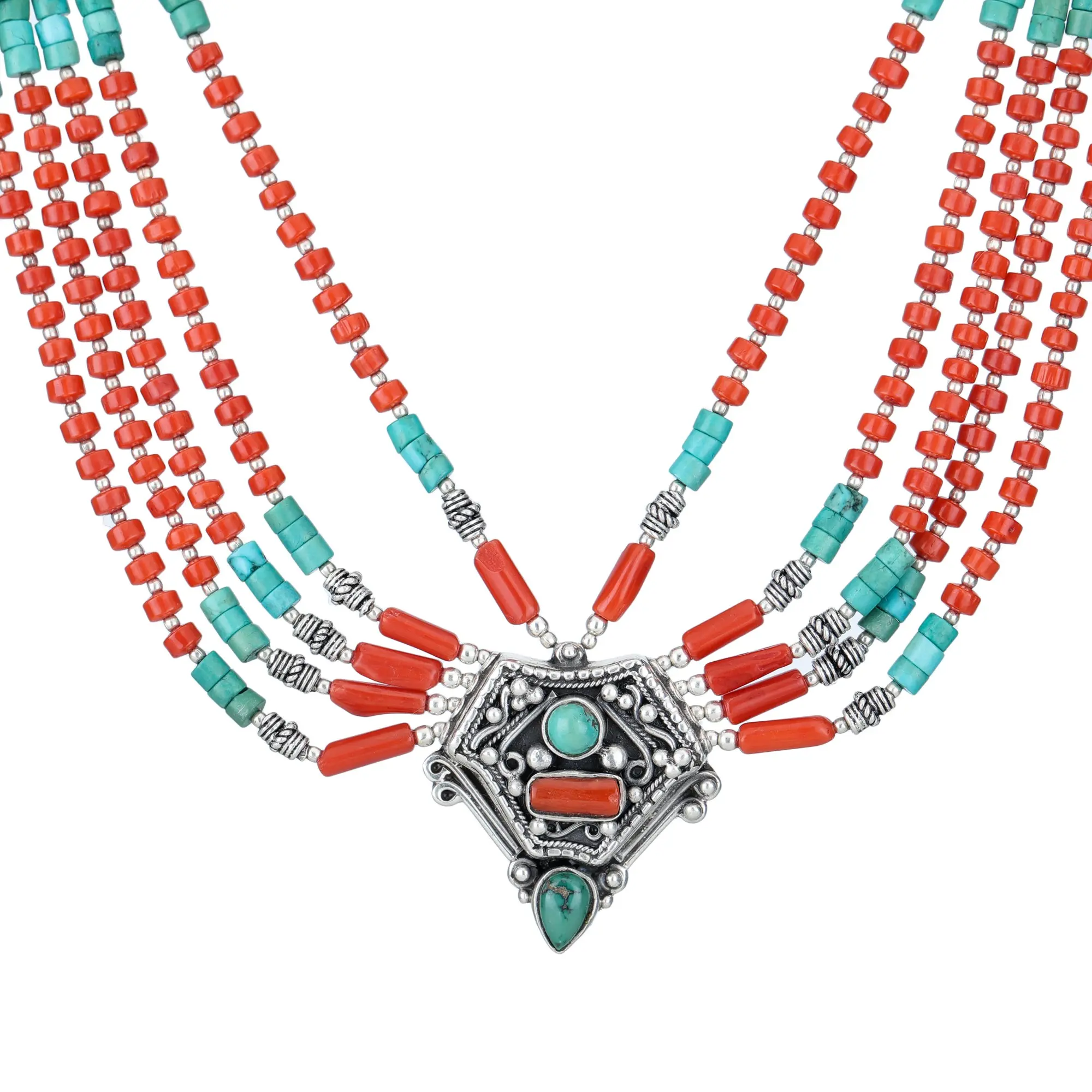 Elevate your style with this captivating necklace, a stunning fusion of vibrant color and intricate design. The necklace showcases a dynamic blend of earthy coral and refreshing turquoise beads, creating a visually arresting contrast that draws the eye. Each bead is carefully selected for its rich hue and smooth texture, contributing to the overall luxurious feel of the piece. The interplay of colors evokes a sense of natural beauty, reminiscent of sun-drenched landscapes and clear blue skies.
