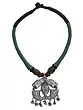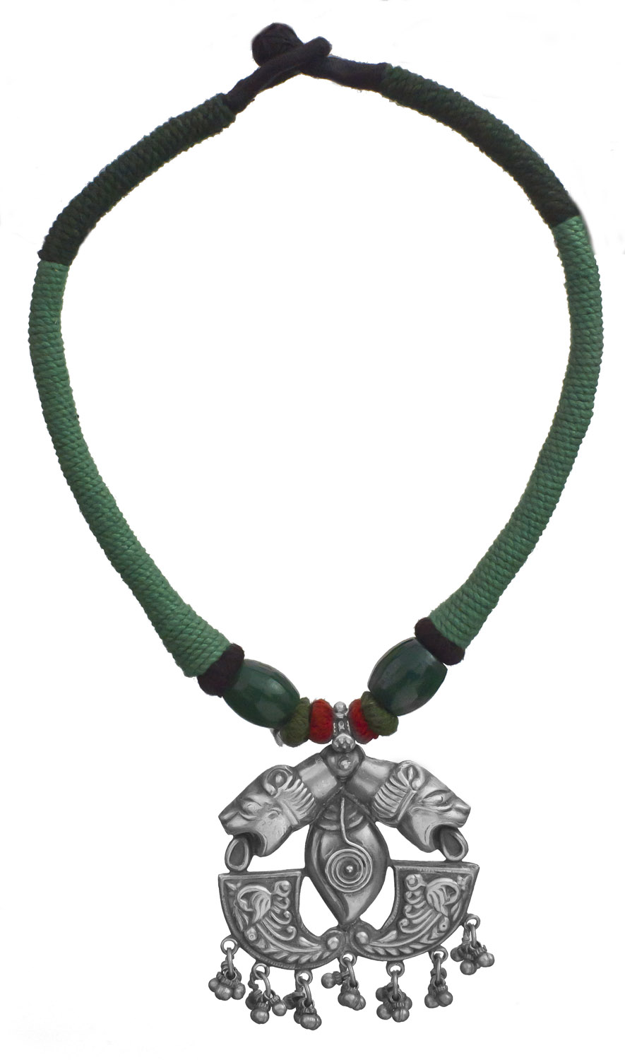 The robust sterling silver pendant features a captivating design, with two majestic lion heads flanking a stylized central form, each rendered with expressive detail. Below this, a series of delicately crafted, bell-like charms offer a subtle, melodious accent when in motion. This captivating pendant is suspended from a 16.5-inch cord, expertly woven with contrasting shades of deep forest green and black, further accented by lustrous, dark green beads that complement the metallic artistry.