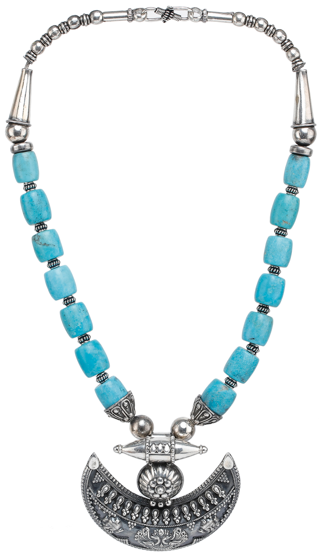 Introducing the Crescent Turquoise Necklace—an exquisite piece where the graceful crescent meets the captivating allure of turquoise gemstones. With its crescent design exuding sophistication and the vibrant hues of turquoise adding a burst of color, this necklace is a harmonious blend of style and symbolism. Beyond mere ornamentation, it invites wearers to appreciate the elegance of the crescent while embracing the cultural and spiritual richness embodied by turquoise. It's not just jewelry; it's a fusion of artistry and meaning, making the Crescent Turquoise Necklace a distinctive and meaningful accessory.
