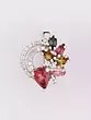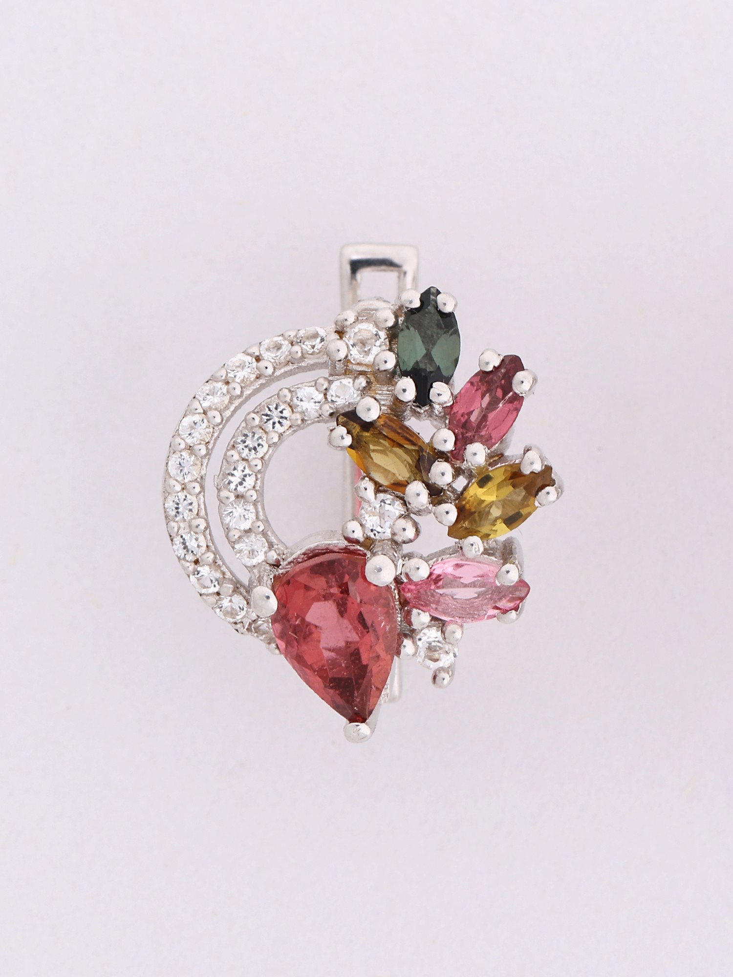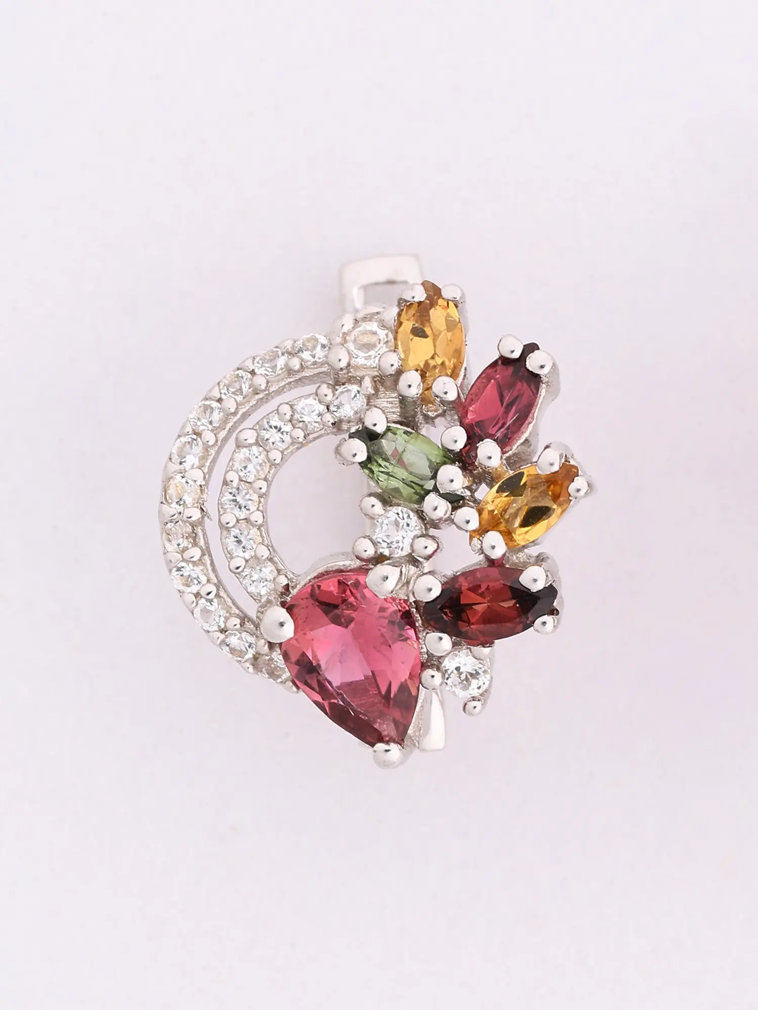 The design gracefully balances intricate detailing with a delicate, organic form. A central, heart-shaped tourmaline, rendered in a captivating pink, forms the focal point, drawing the eye with its depth and brilliance. Arrayed around it, smaller marquise-cut tourmalines in an assortment of greens, yellows, and deeper reds create a painterly effect, reminiscent of a scattered bouquet of jewels. The subtle, curved outline of polished sterling silver, encrusted with sparkling cubic zirconia, provides a graceful framework that measures approximately 0.25 inches in height and 0.2 inches in width, ensuring a sophisticated and comfortable presence.