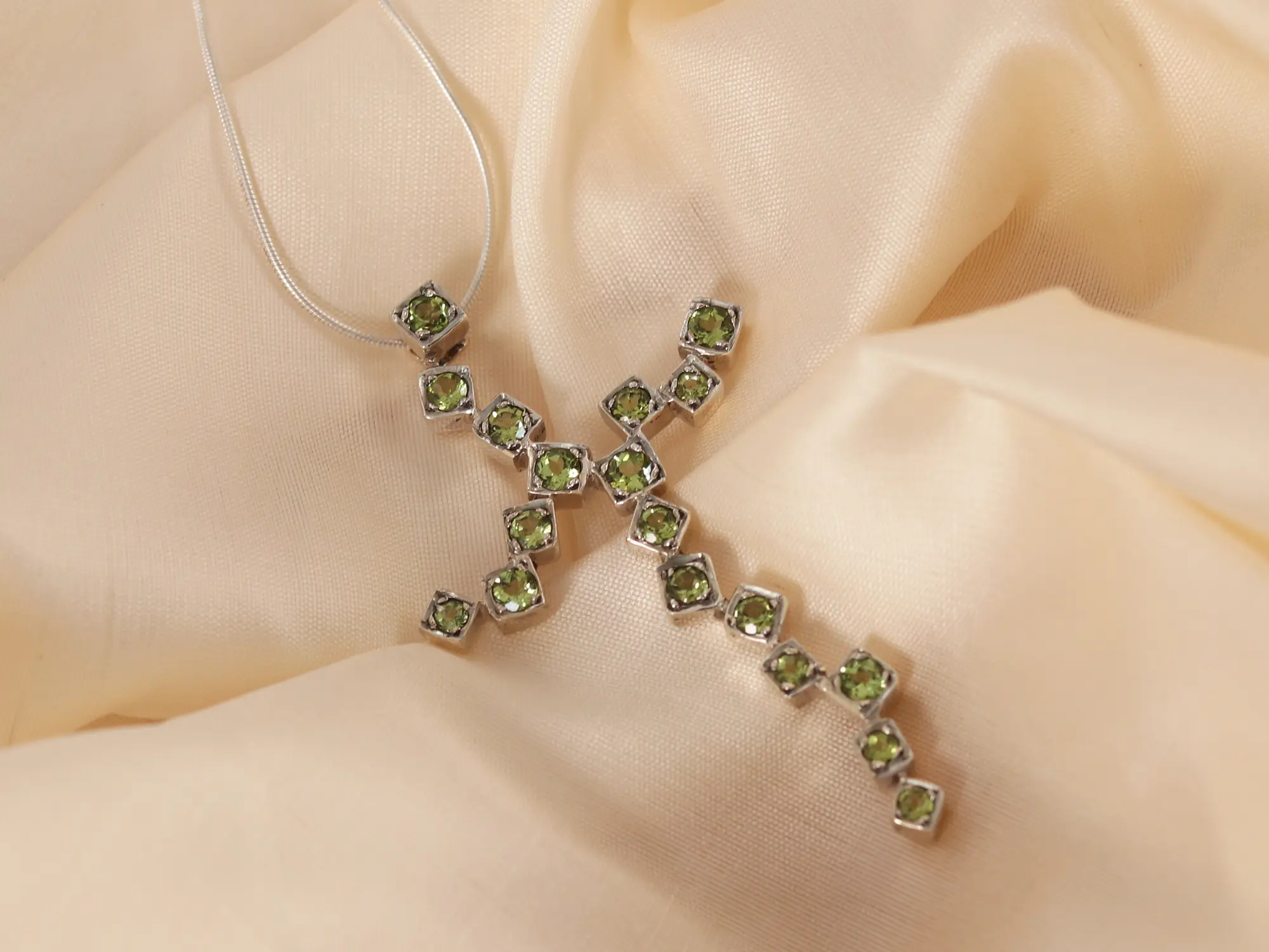 Witness the divine elegance through the Designer Asymmetric Cross Pendant, a sterling silver masterpiece that redefines tradition. This unique cross takes an unconventional, curvy form, with wavy longitudinal and attitudinal arms creating a striking design. Stones, encased within individual silver frames, are artfully arranged in succession, forming the cross pattern. The seamless integration of these stones within the silver structure gives the impression of singular entities harmoniously embodying the cross. The pendant not only signifies timeless spirituality but also showcases innovative design, making it a captivating and symbolic accessory for those who appreciate the blend of tradition and contemporary aesthetics.