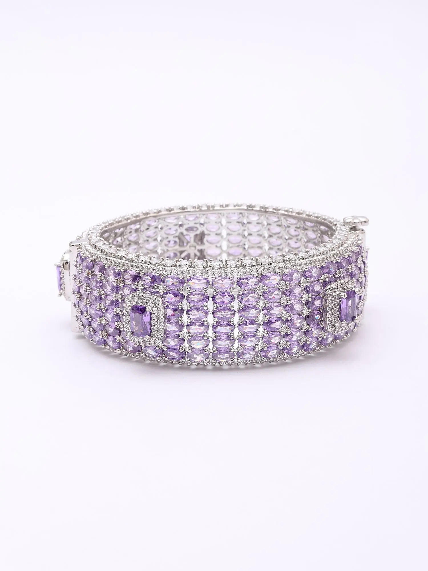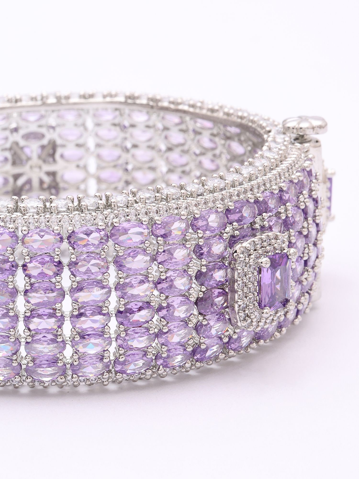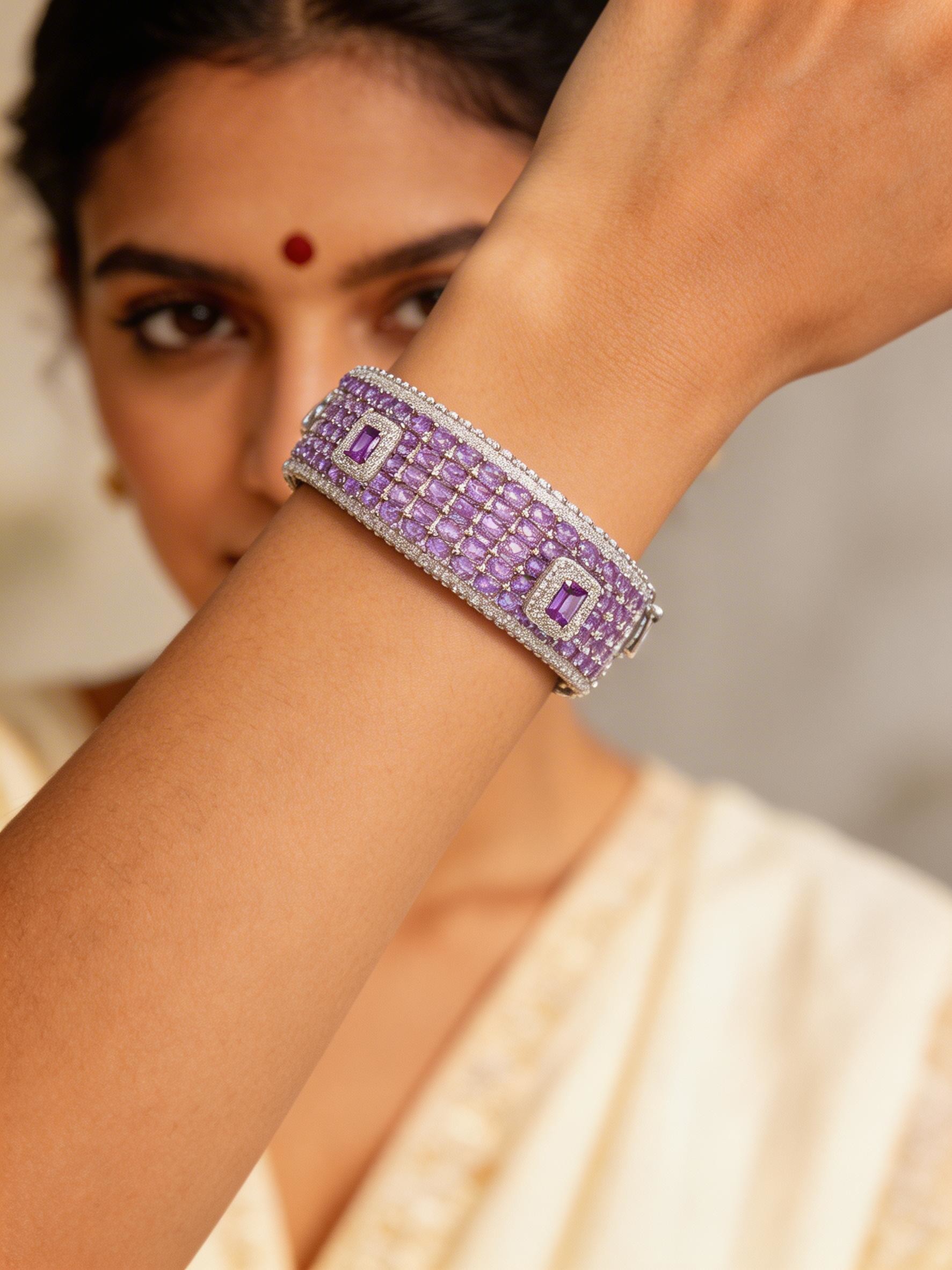 Measuring a striking 0.90 inches in height, this substantial piece makes a captivating impression without overwhelming your wrist. The inner diameter of 1.90 inches ensures a comfortable yet secure fit, while the openable design allows for effortless wear. Drenched in scintillating cubic zirconia, the amethyst-hued stones are precisely cut to refract light with every movement, creating an almost celestial glow that is simply mesmerizing.