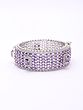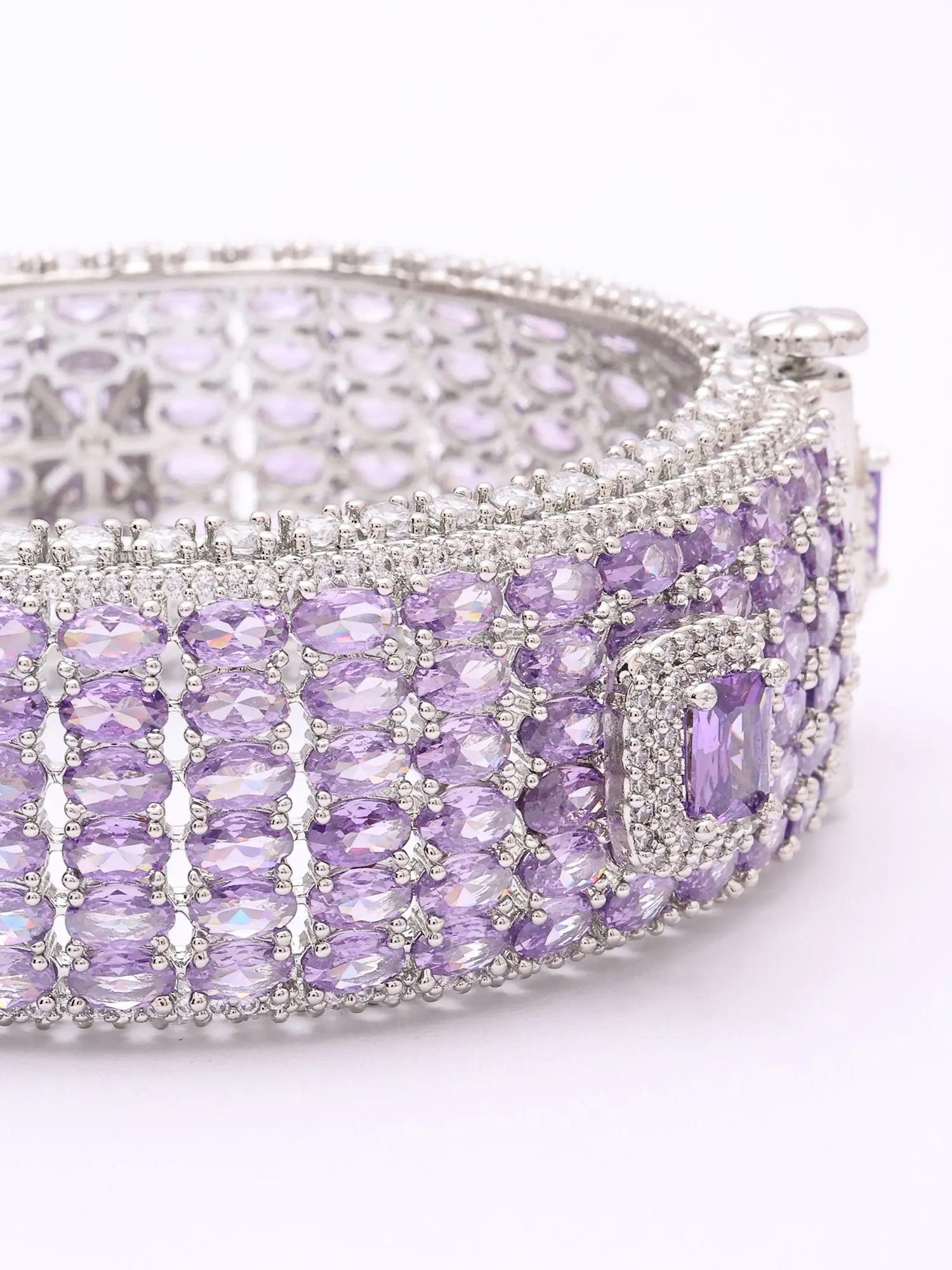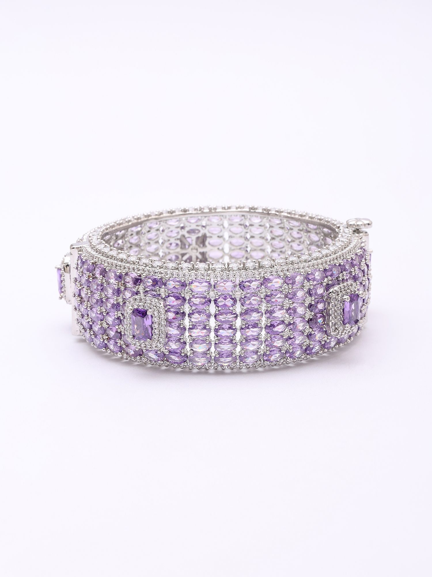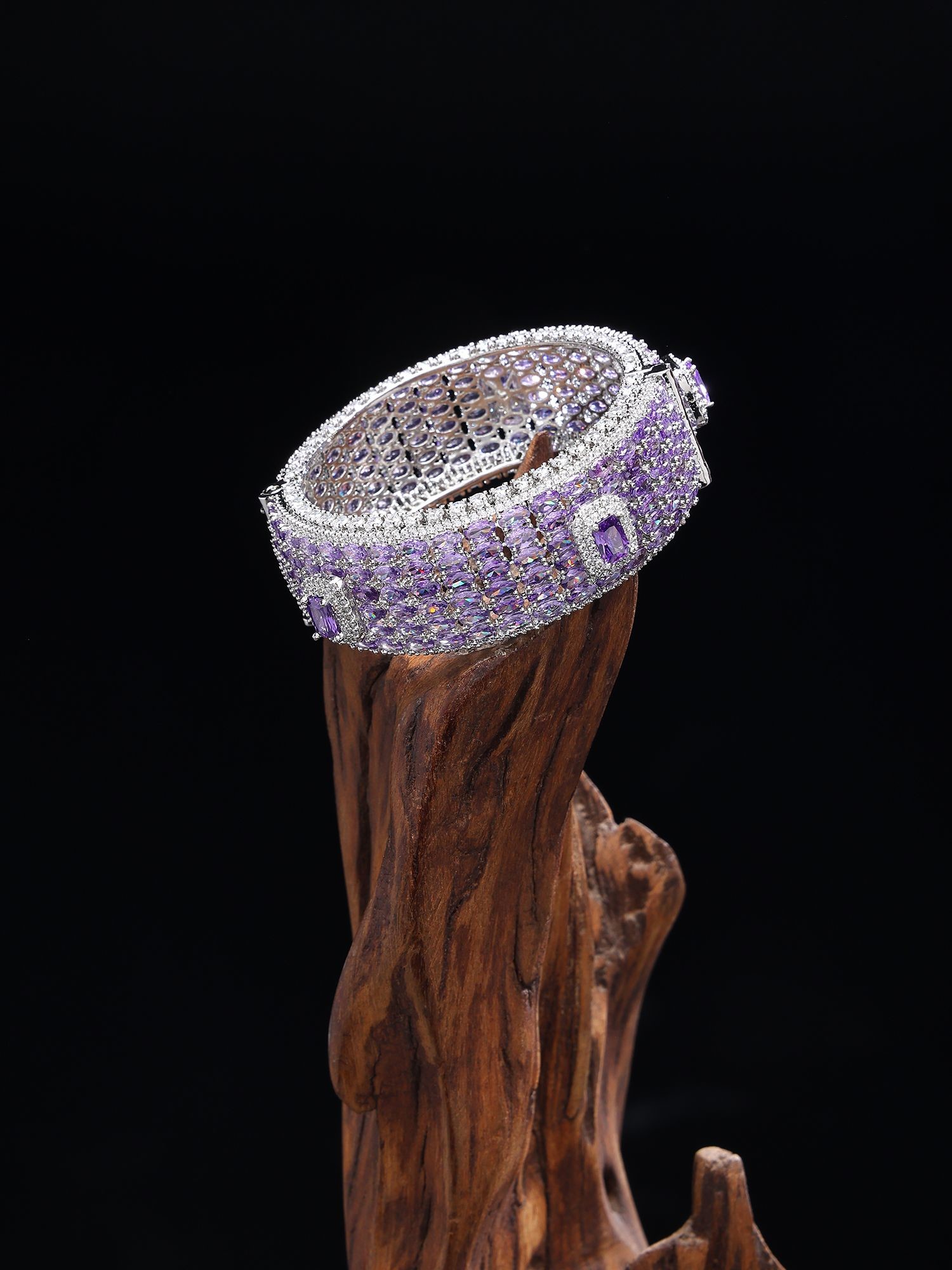 Measuring a striking 0.90 inches in height, this substantial piece makes a captivating impression without overwhelming your wrist. The inner diameter of 1.90 inches ensures a comfortable yet secure fit, while the openable design allows for effortless wear. Drenched in scintillating cubic zirconia, the amethyst-hued stones are precisely cut to refract light with every movement, creating an almost celestial glow that is simply mesmerizing.