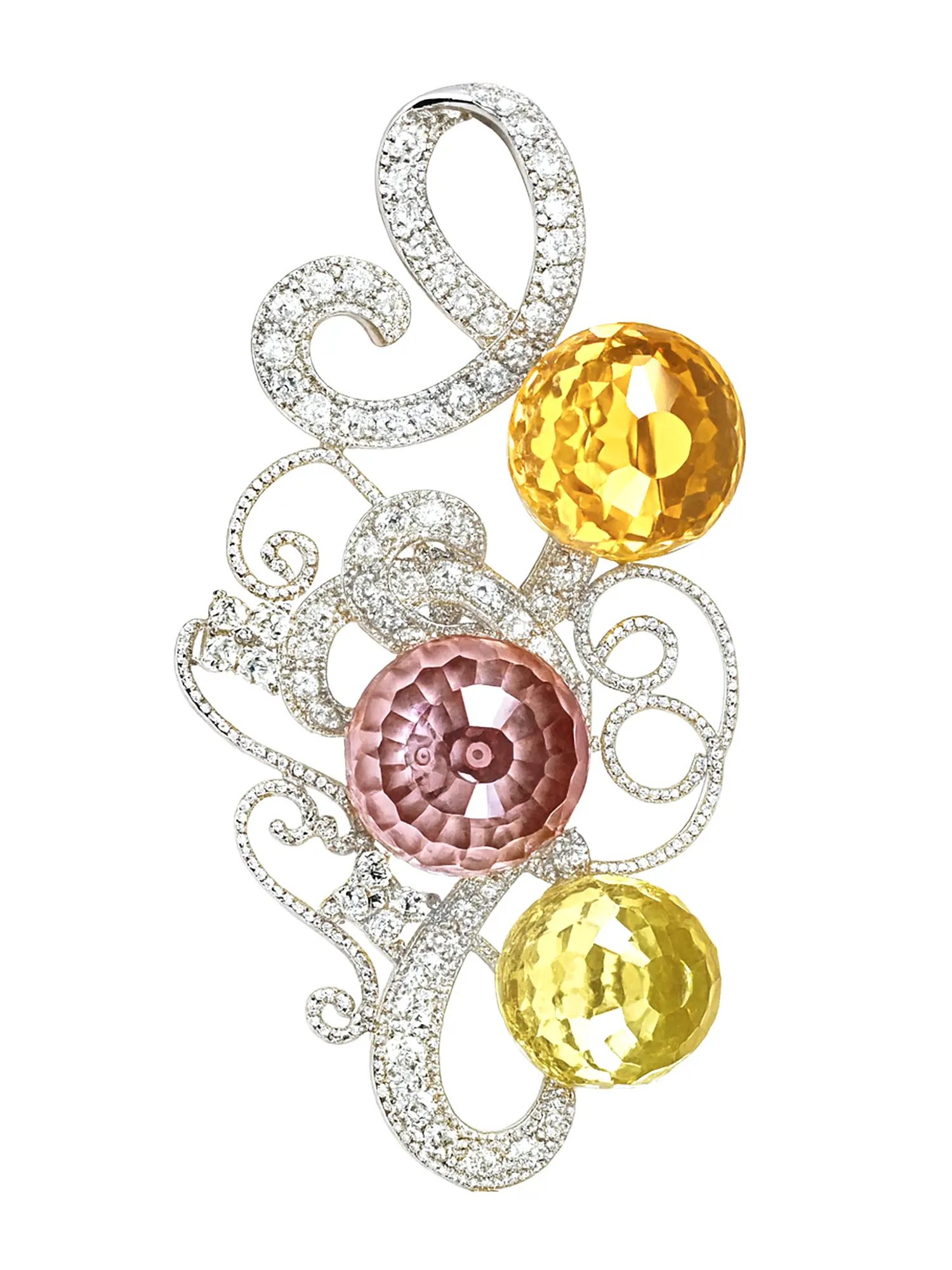 The centerpiece is graced by three generously sized, faceted gemstones, each possessing a unique, radiant hue that catches the light with breathtaking brilliance. These colorful jewels are embraced by an intricate filigree of sterling silver, studded with countless tiny cubic zirconia that shimmer like a constellation. The overall design, measuring approximately two inches in height and one inch in width, offers a balanced and visually striking presence without overwhelming the wearer.