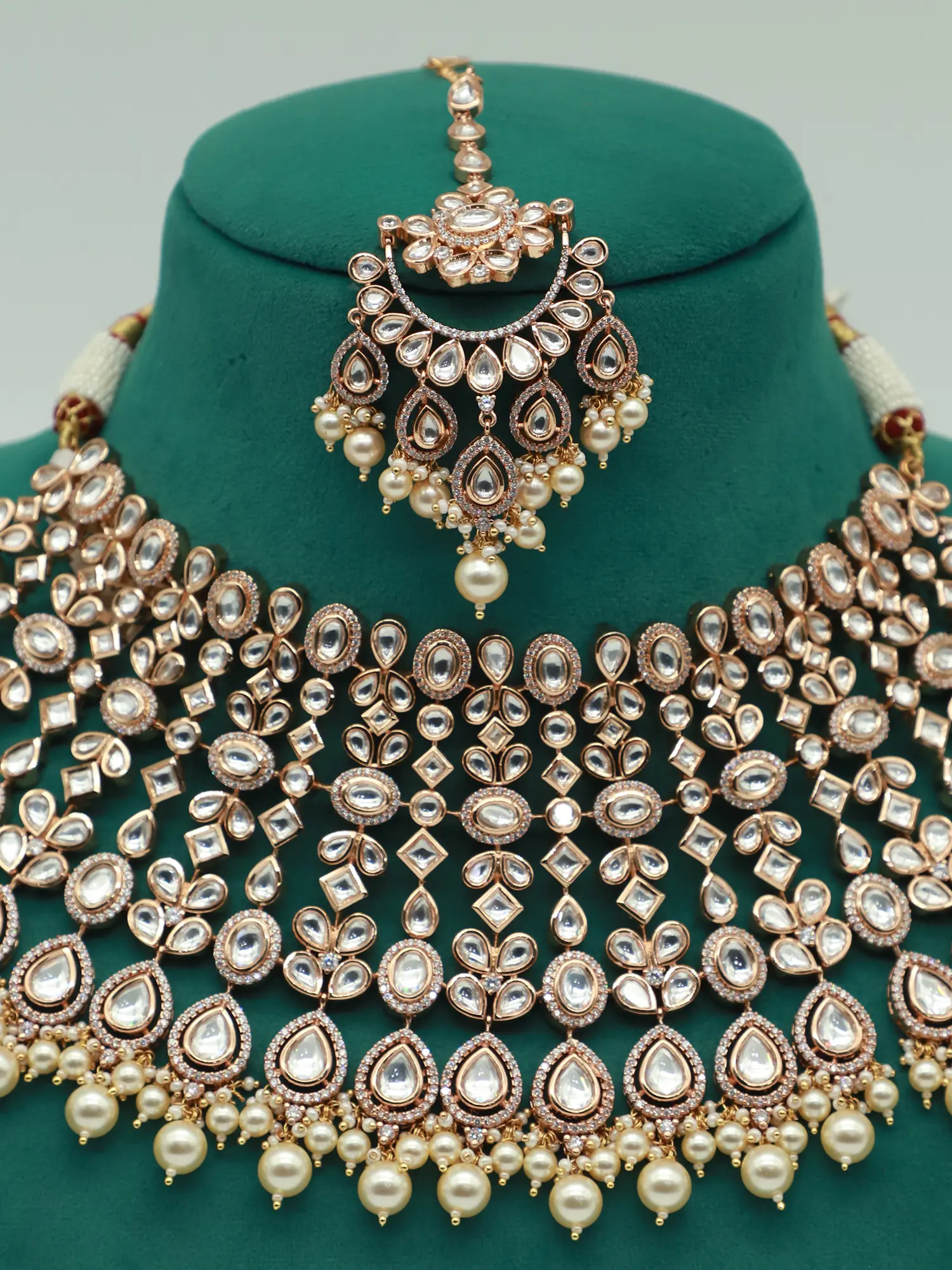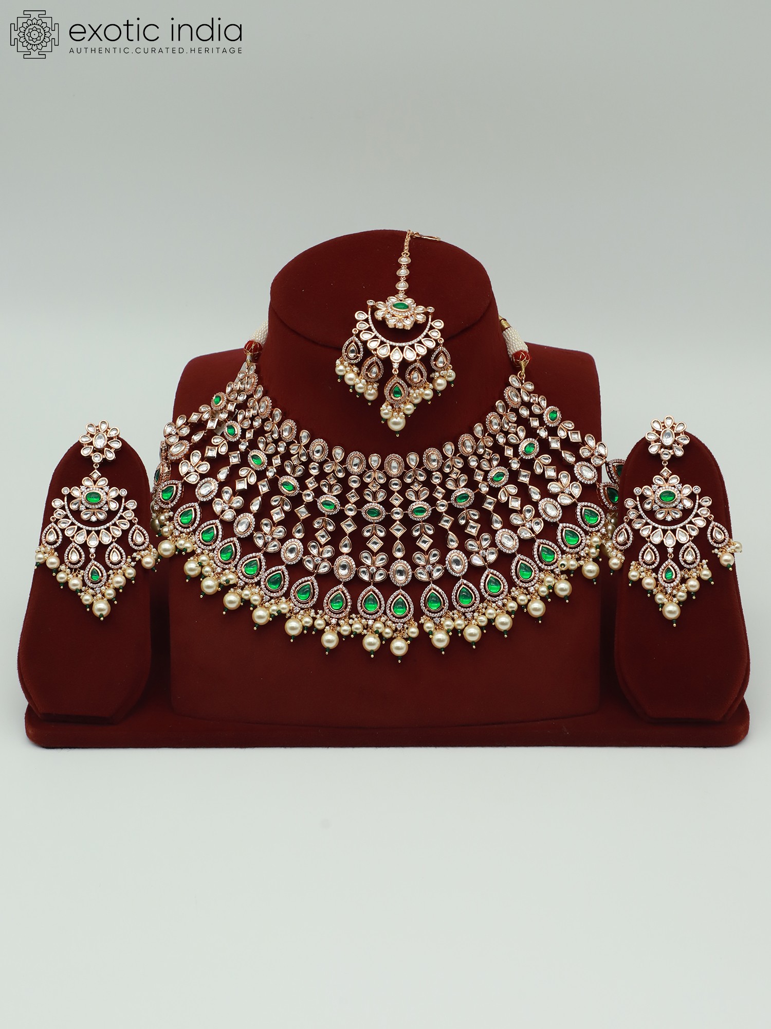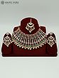 This set is more than just a necklace; it's a complete statement. It includes a meticulously crafted necklace, a pair of exquisitely designed earrings, and a graceful Mangtika, each perfectly complementing the others. The coordinated design of the three pieces creates a harmonious and cohesive look that is sure to impress. With every piece working in unison to enhance the others, the overall effect is one of refined elegance and undeniable allure.