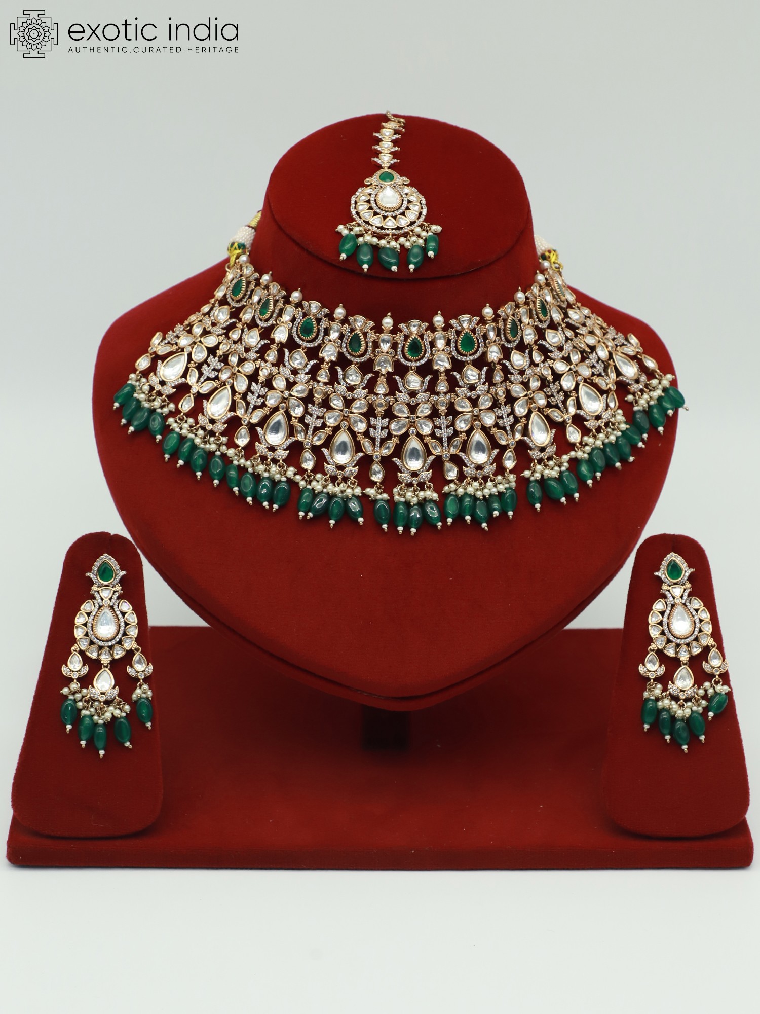 Brass Heavy Necklace Set With Kundan Mangtika And Beads Earrings