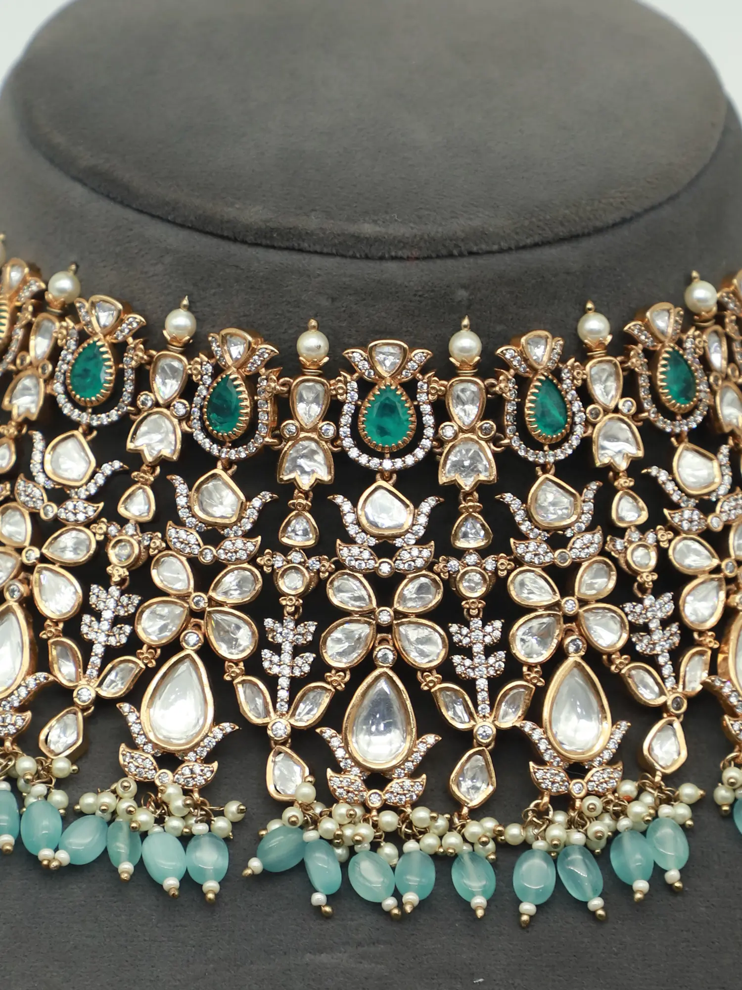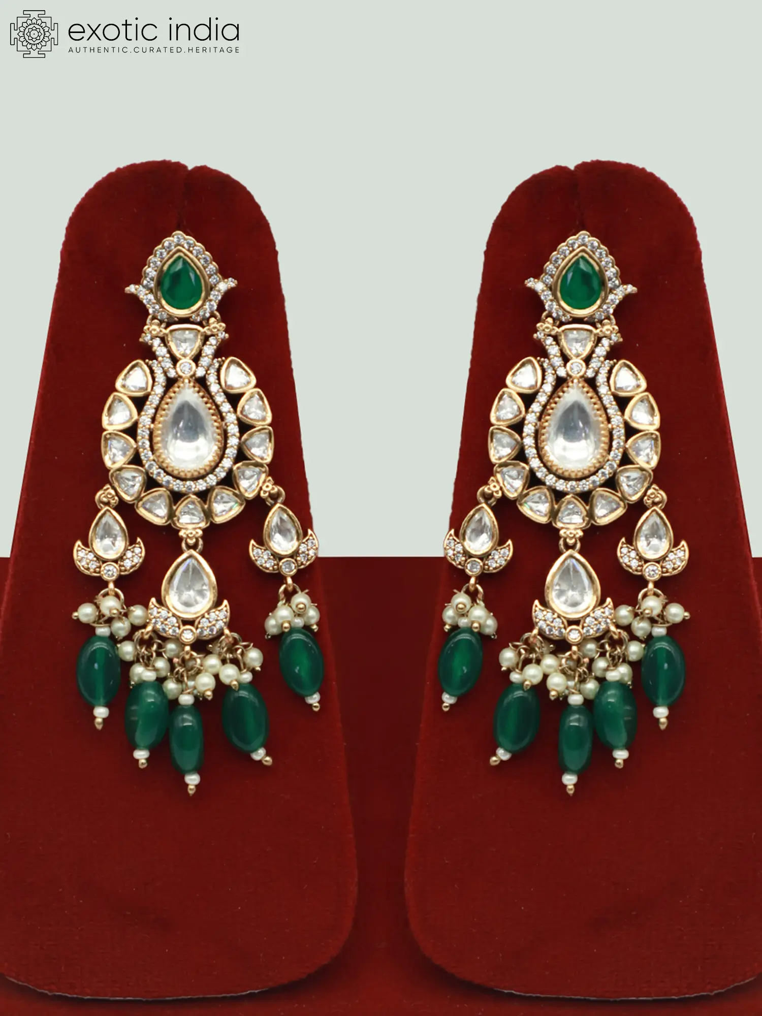 At the heart of this set lies the radiant allure of Moissanite Kundan. Each stone has been carefully set to capture and reflect light, creating a dazzling sparkle that draws the eye. The Kundan setting, an ancient Indian jewelry technique, adds a touch of regal charm, infusing the set with a rich cultural heritage. The overall effect is one of opulence and sophistication. The juxtaposition of the Moissanite Kundan with carefully selected stones adds further to the allure of the piece.