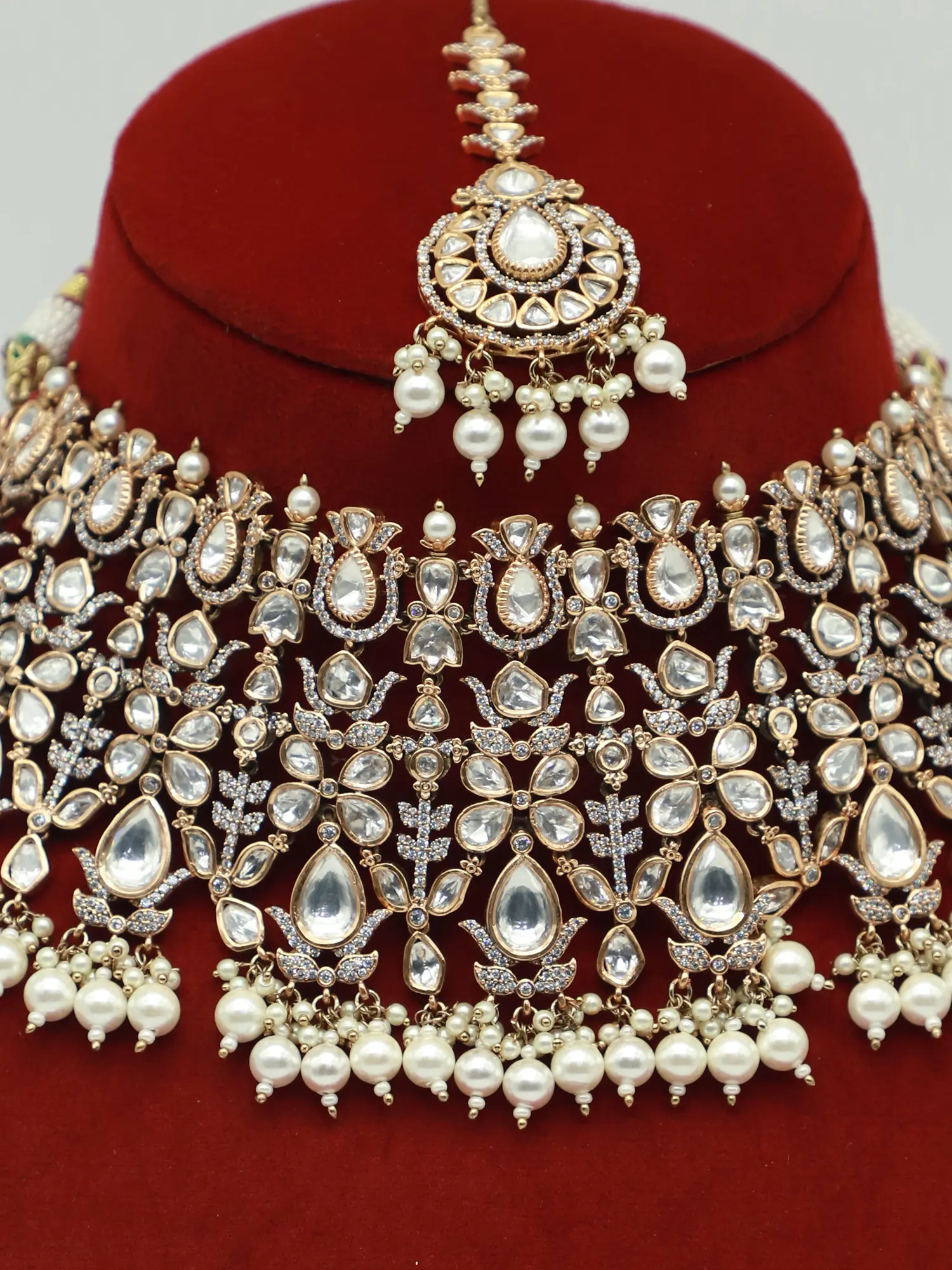 Stone Studded Brass Heavy Necklace Set With Earrings And Mangtika