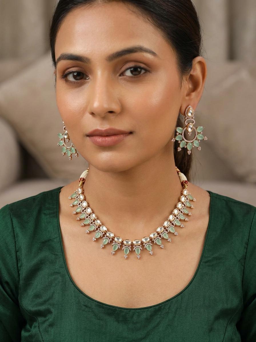 Stone Studded Moissanite Kundan Exquisite Necklace With Matching Earrings