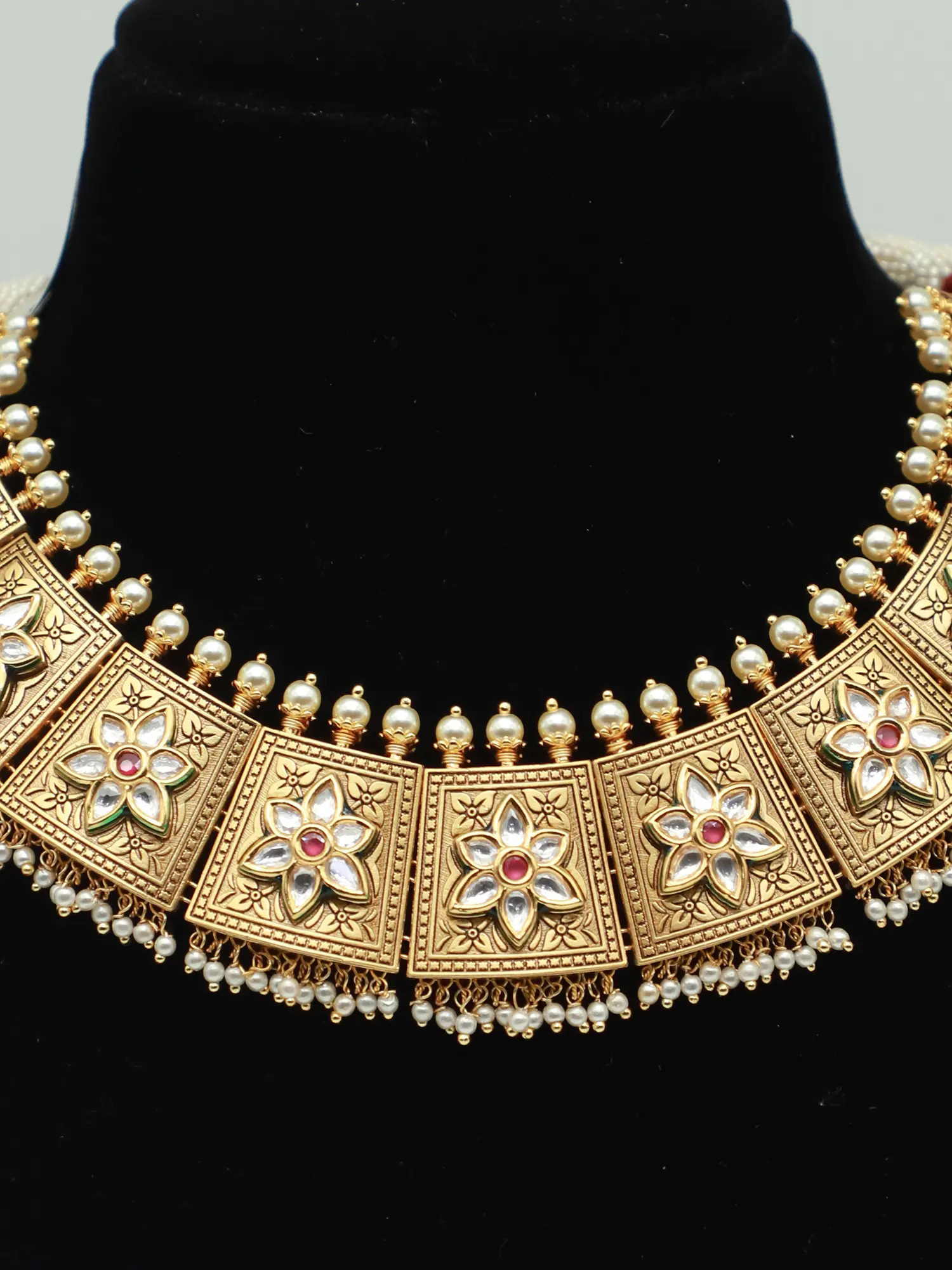 Elevate your ensemble with this captivating necklace set, a perfect blend of traditional artistry and contemporary design. This set isn't just jewelry; it's a statement piece that radiates sophistication and elevates any outfit. The matte finish adds a touch of understated luxury, making it versatile enough for both formal occasions and adding a touch of glamour to everyday wear. Every detail is carefully crafted to capture the essence of timeless elegance.