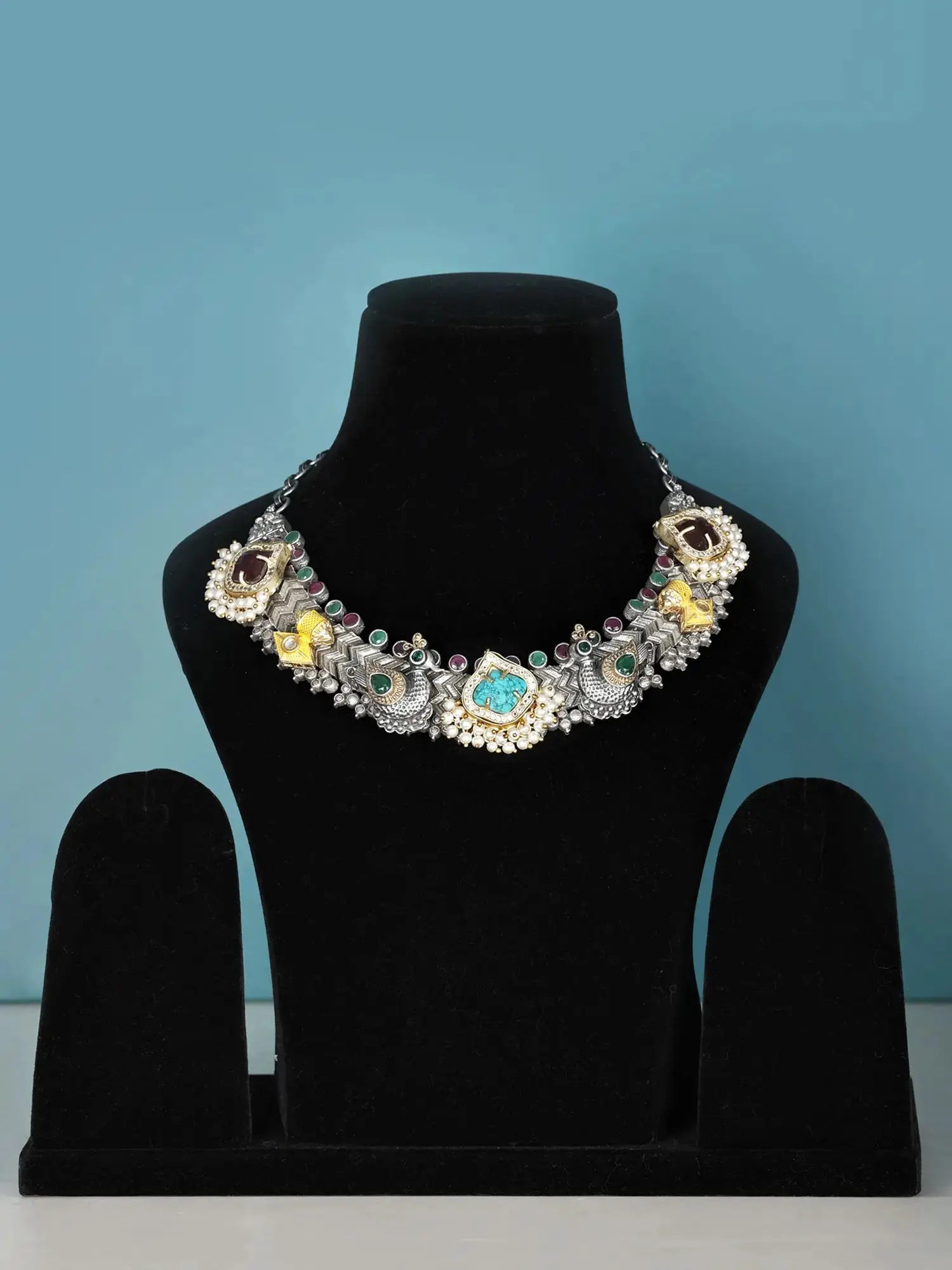 A vibrant blue-green turquoise takes the central space in this necklace, circled by cubic zirconia. Repetition of rubies and emeralds on top and pearls with maroon-brown coral at the bottom create a pleasing visual regularity. Ducks- a symbol of nurturing and grace, inlaid with green onyx add to the charm of this stylish necklace.