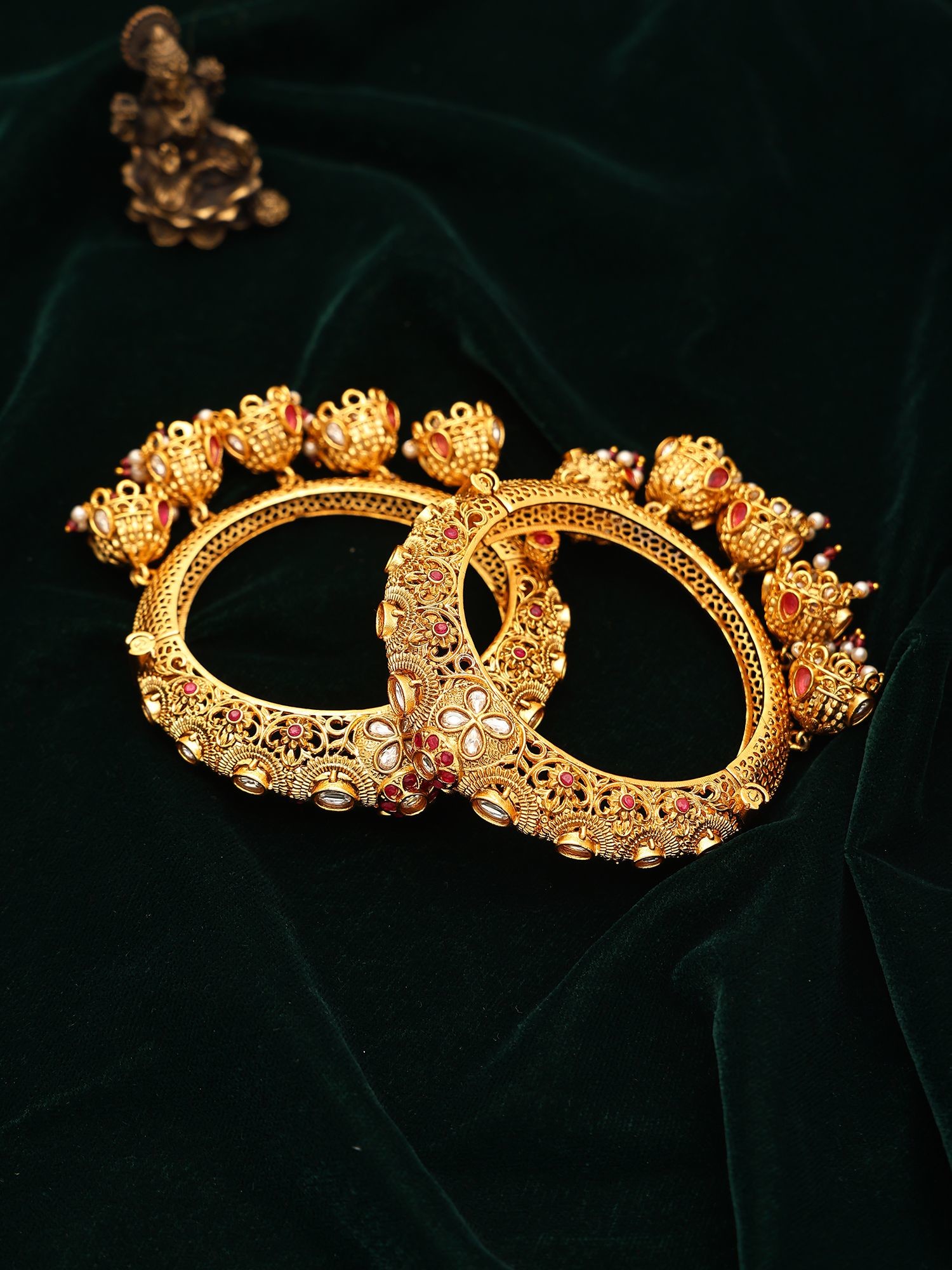 You’ll be mesmerized by the vibrant polki stones and charming jhumka drops that adorn these bangles, adding a delightful movement and sparkle with every gesture. The openable design ensures a comfortable and secure fit, allowing you to slip them on and off with ease. The rich, golden hue of the copper provides a warm and inviting base for the dazzling stones, creating a harmonious and sophisticated aesthetic.