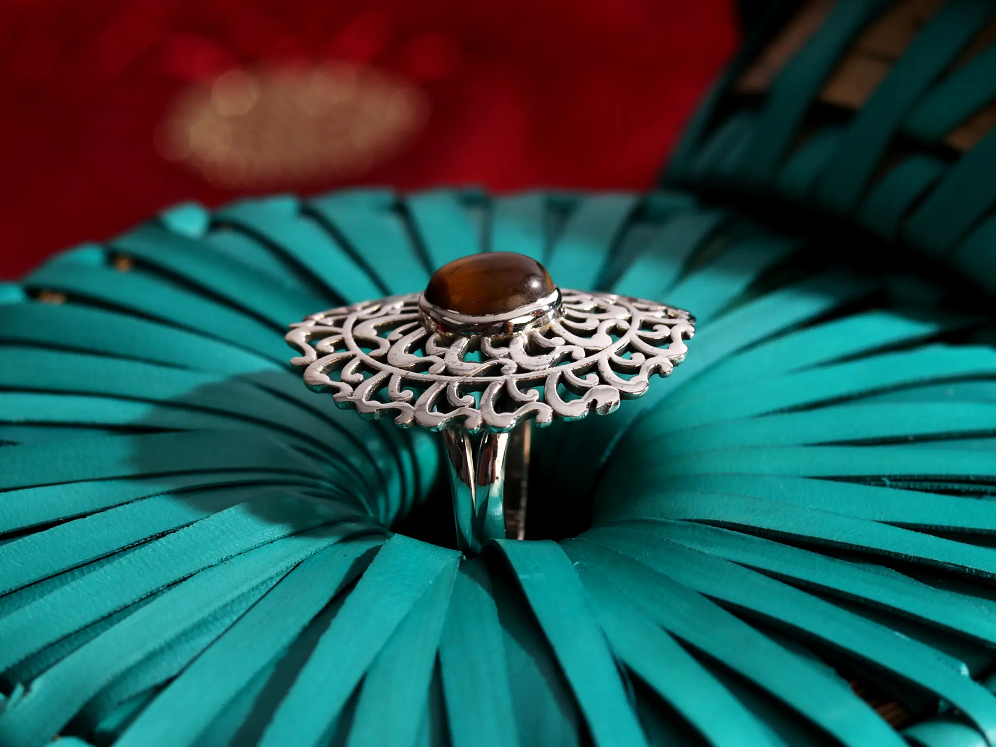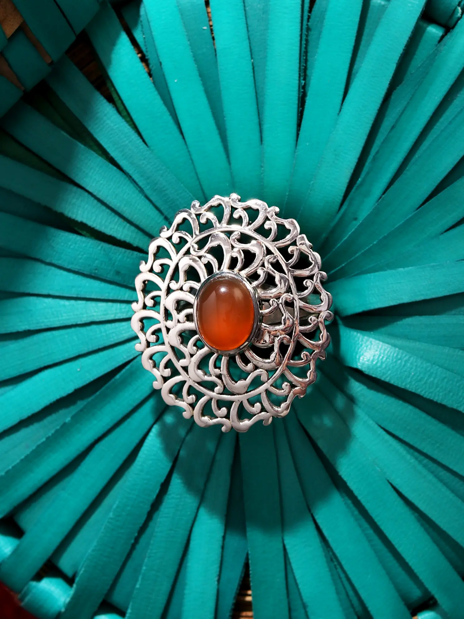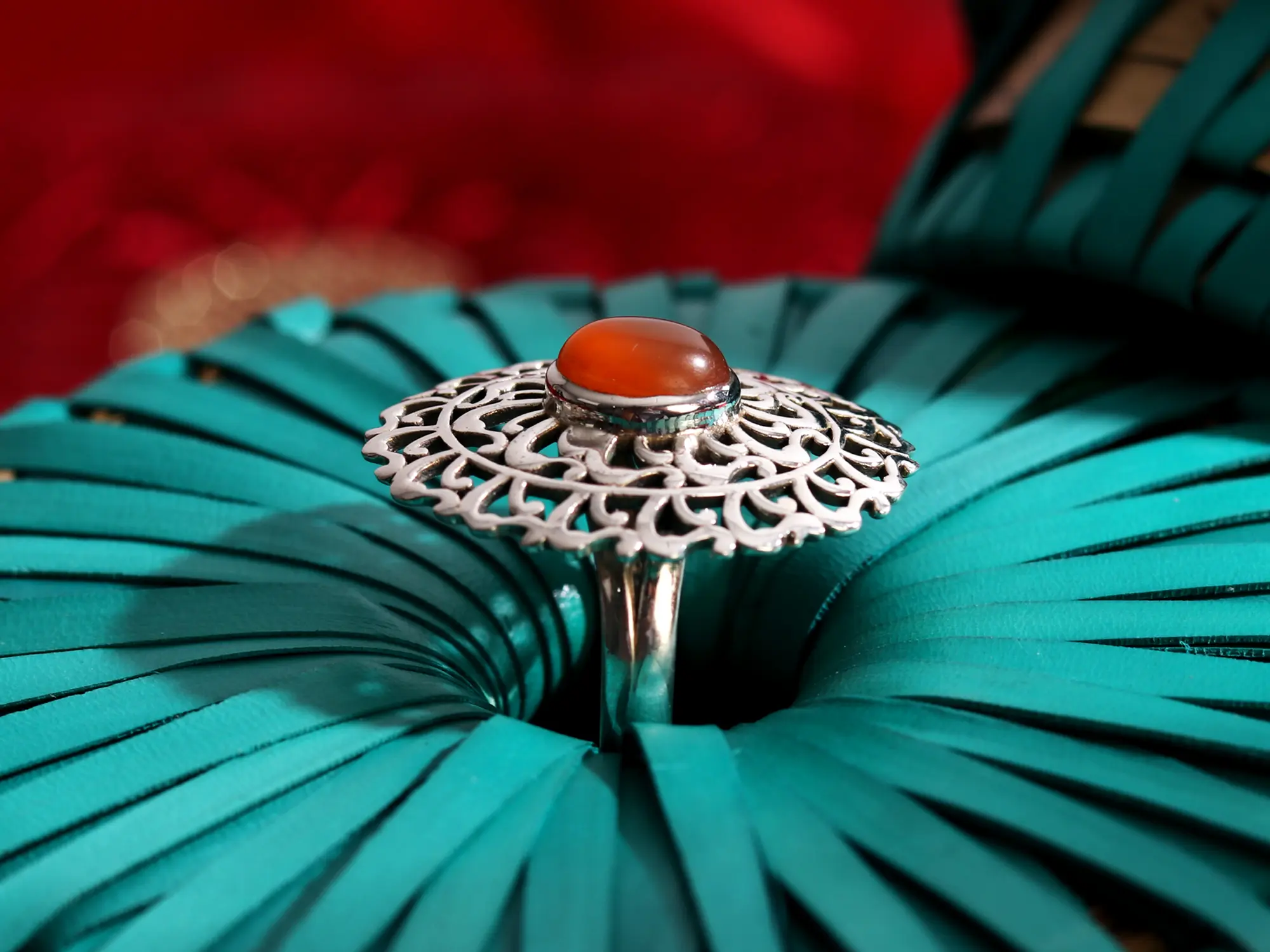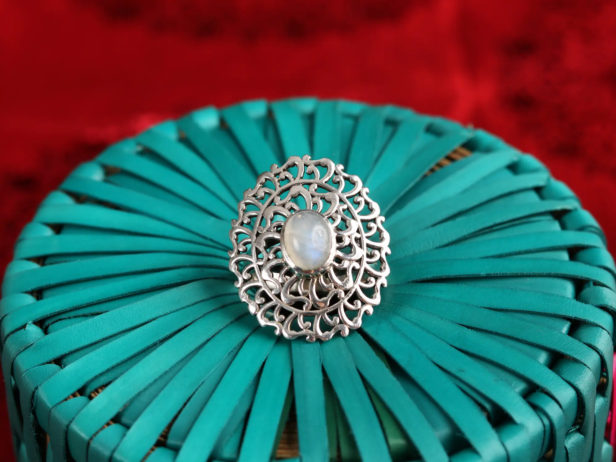 This Oval Stone Sterling Silver Ring is an exquisite fusion of artistry and elegance. At its heart lies a mesmerizing blue stone, exuding a tranquil allure. The sterling silver setting is adorned with lines that elegantly emerge like sunrays, encircling the stone with a celestial grace. This thoughtful design creates a harmonious blend of nature-inspired aesthetics and contemporary style. This bright jewelry is a testament to the age-old traditions of Shringar and allows the beholder to delve into the boundless options of jewelry.