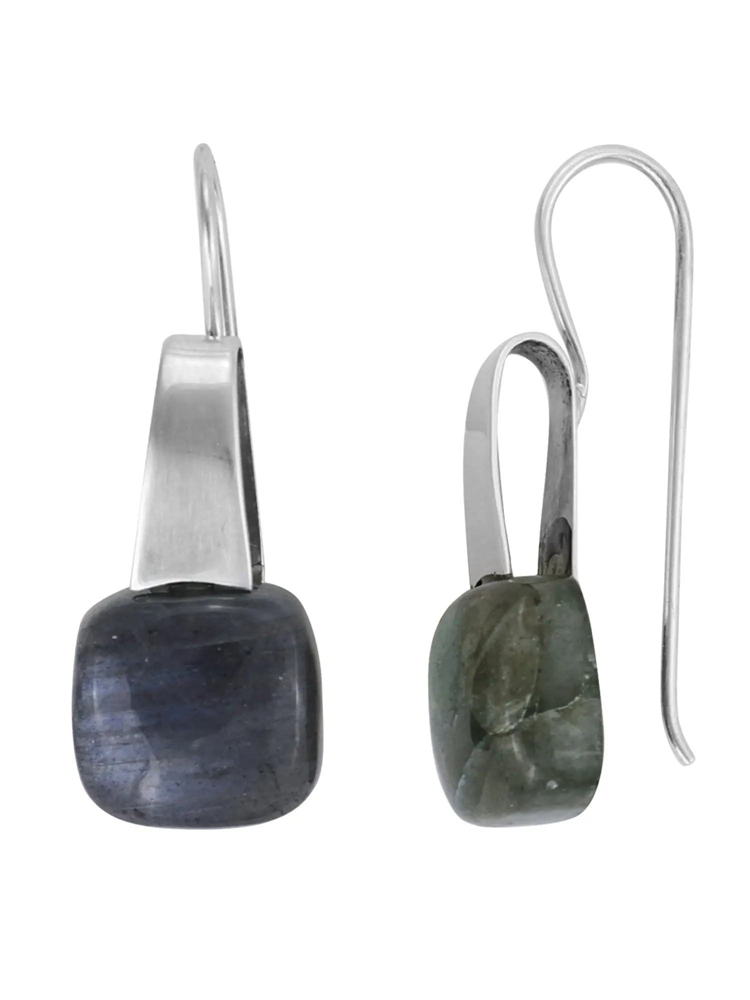 Introducing to you these beautifully made labradorite stone earrings, crafted from sterling silver. This gemstone's dark hue makes it a stylish and alluring accessory. Made from sterling silver, these earrings effortlessly combine the ethereal charm of labradorite with a minimalist style. Enjoy the distinctive beauty of labradorite, expertly set in sterling silver to add elegance and understated sophistication to your outfit. With these stylish sterling silver earrings, which combine modern style with the captivating charm of labradorite, you can make a statement.